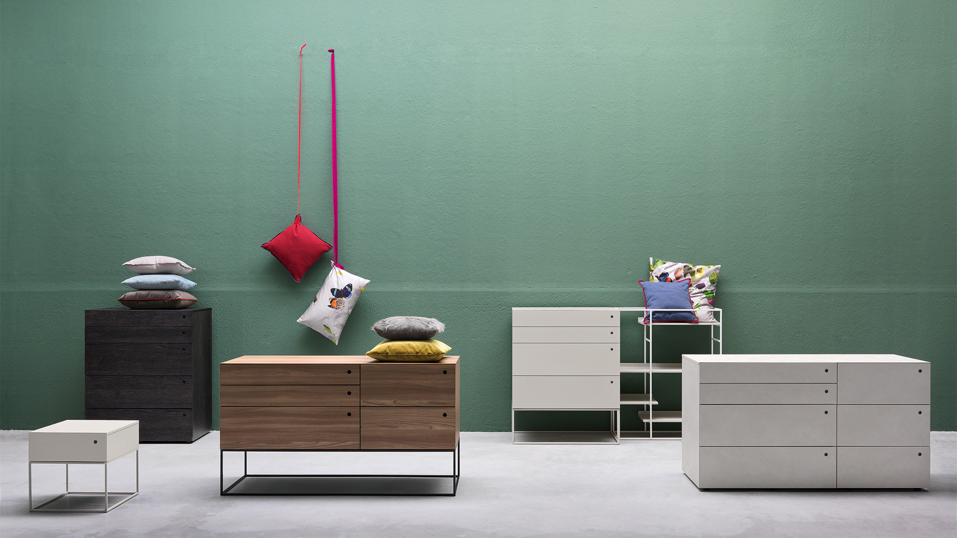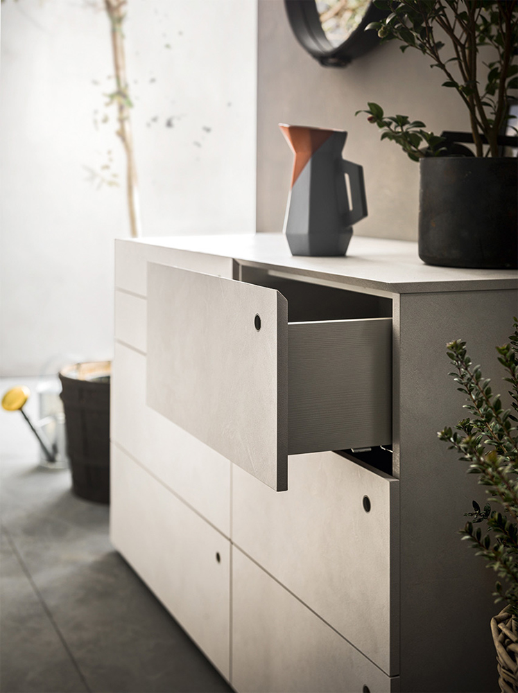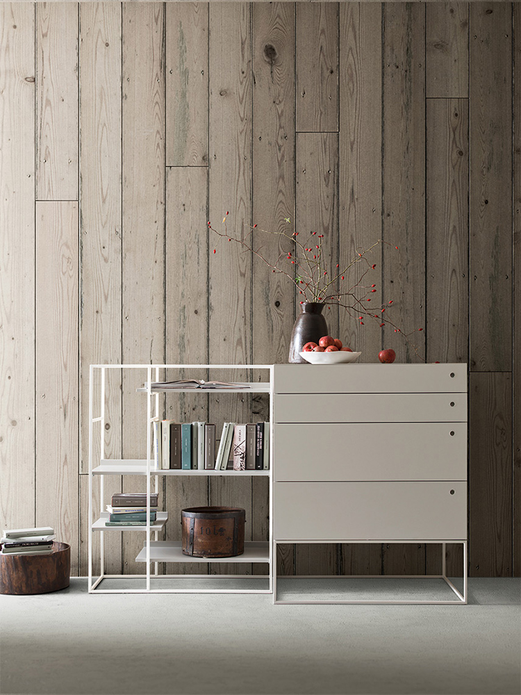 A storage unit that combines minimal design with pure elegance, distinguished by sophisticated elements, such as the metal base and the original small handle.