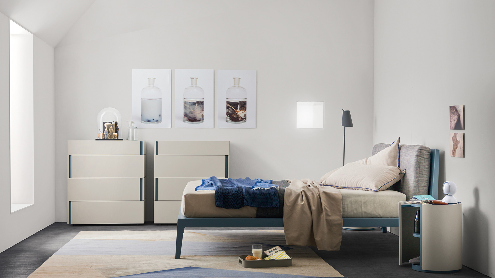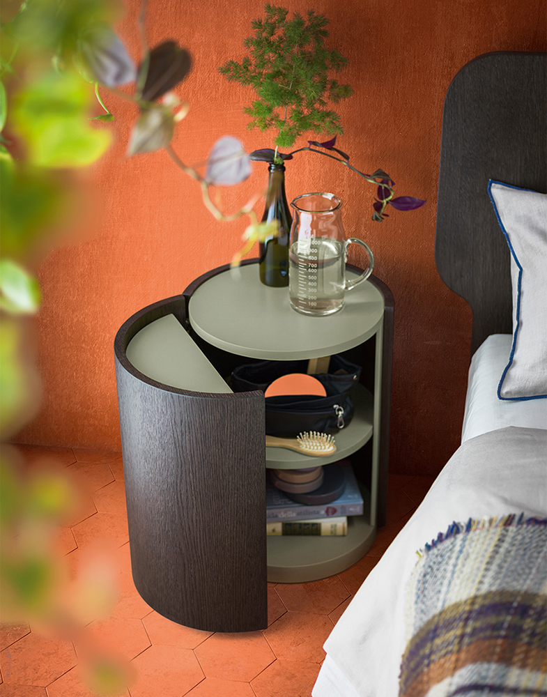 Rim - тумбочка с дверцей или открытой полкой, отличается изогнутыми линиями и компактными размерами. Возможность двухцветного исполнения подчеркивает ее форму и расширяет ее универсальность.