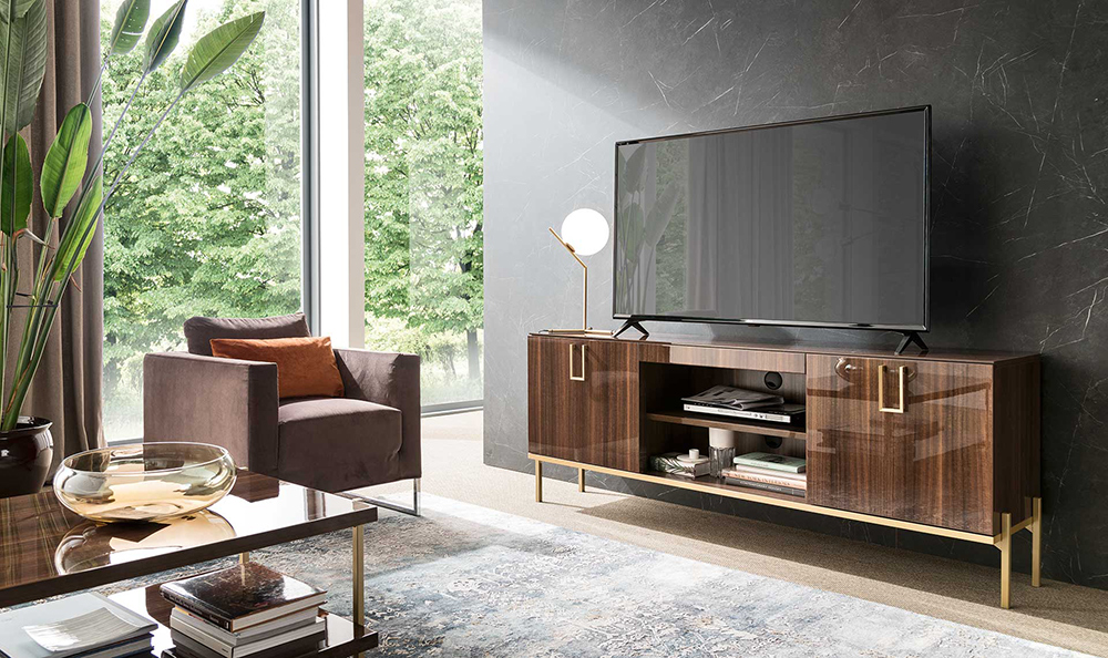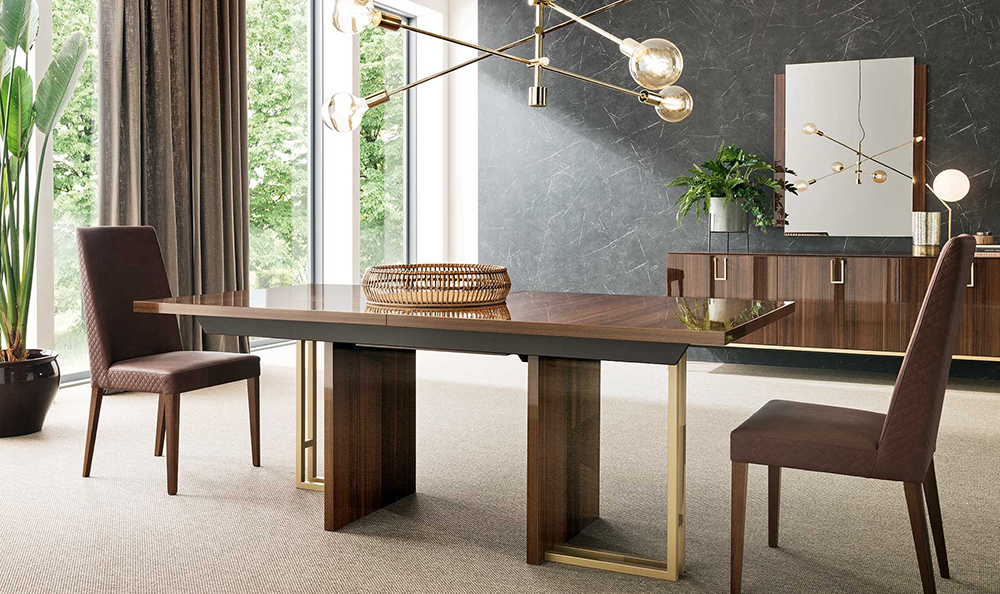 Mid Century dining set is made in brown walnut High Gloss lacquer with a perfectly matching golden finish used for the metal parts.
