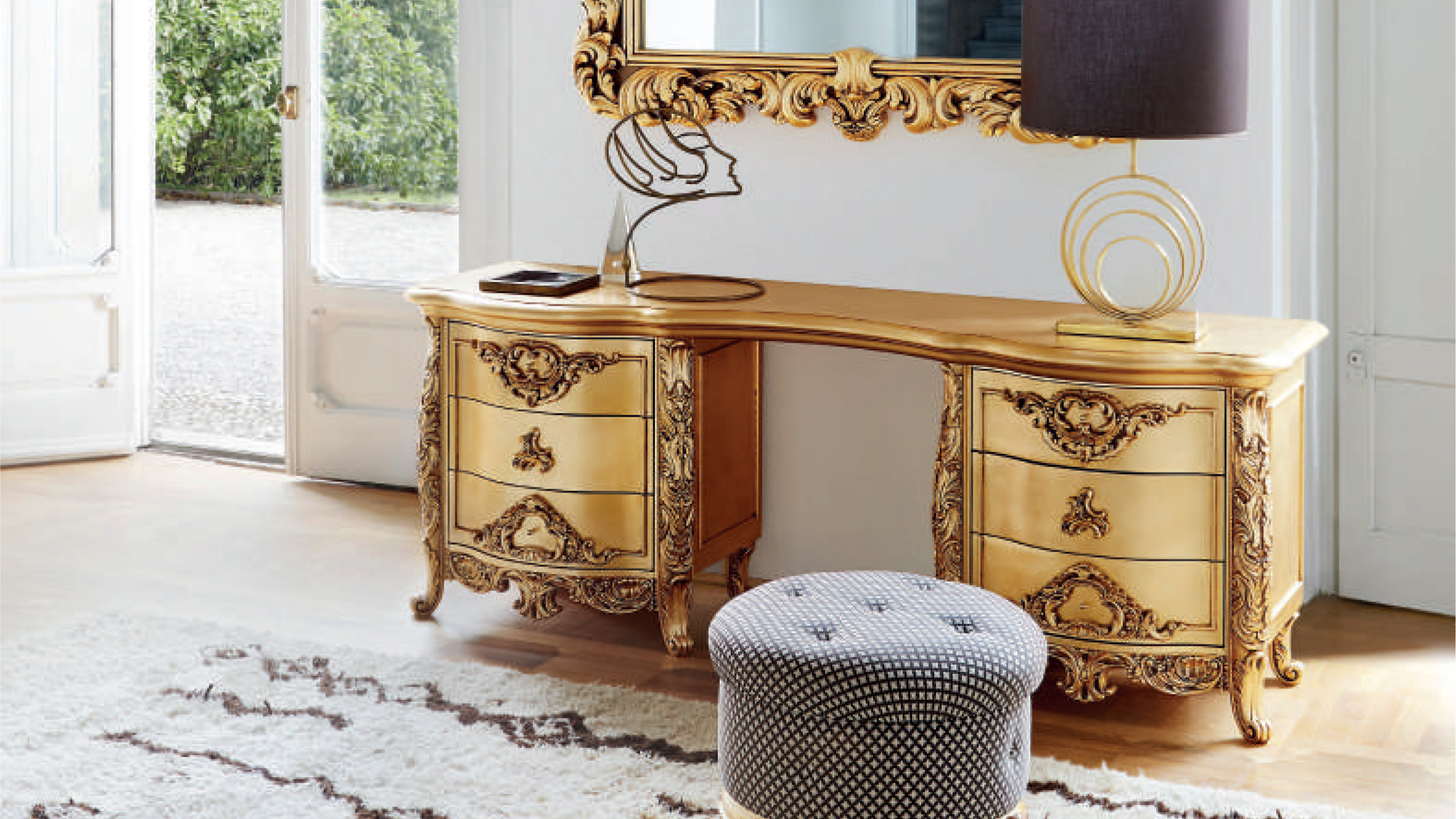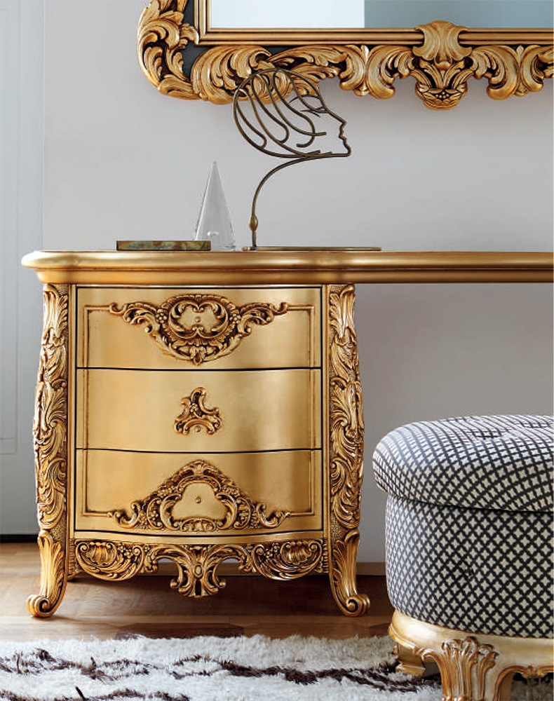 Dressing table with six drawers. Decorated with decorative carvings. Other finishes are possible.