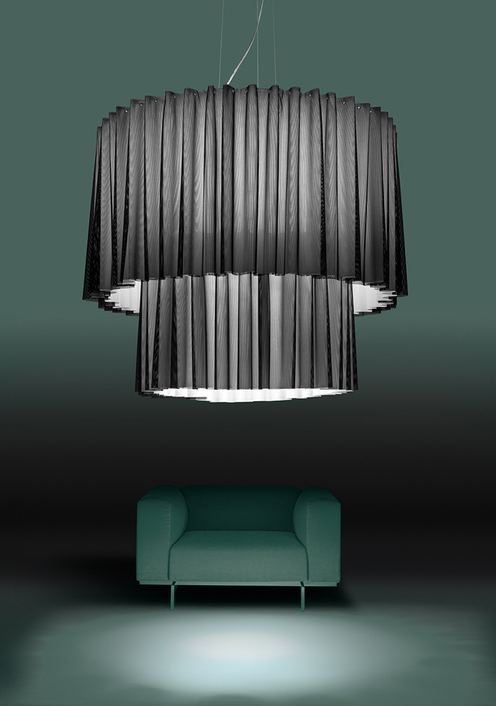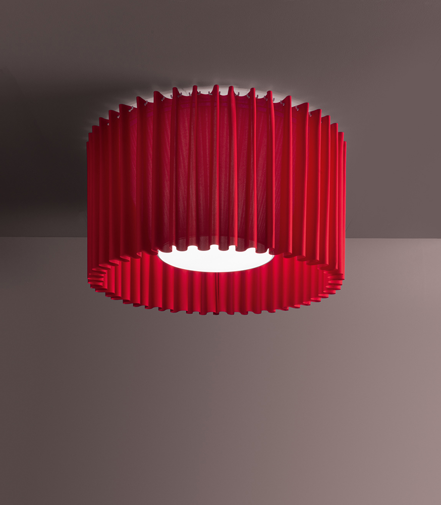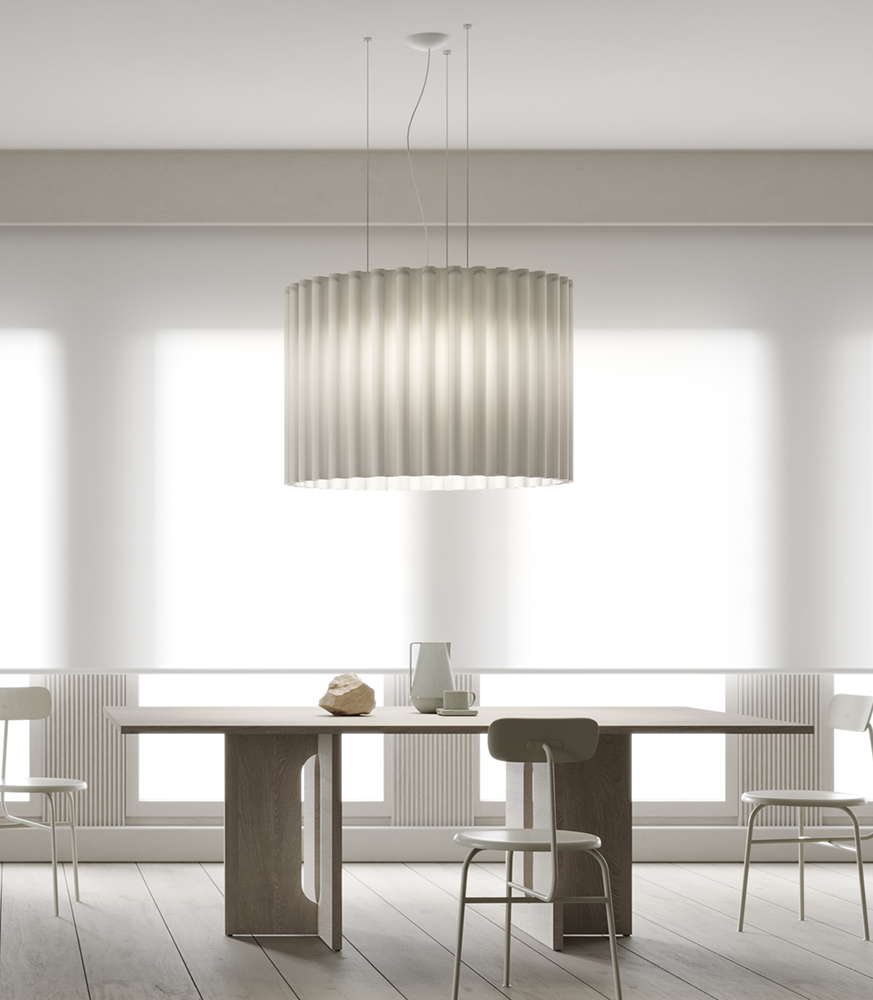 Skirt takes inspiration from the world of fashion, in particular from the garment of the same name. The result is a collection of pendant lamps with a unique and elegant design, given by its sinuous shapes. A collection that can be the focal point of an environment, without surmounting the other elements. A refined design that allows Skirt to adapt to different types of environments, from domestic to contract and hospitality. Its lampshade is composed of a fabric that also has sound-absorbing properties, which allow it to reduce noise by up to 53%, thanks to its Equivalent Absorption Area which reaches a maximum of 3.55.