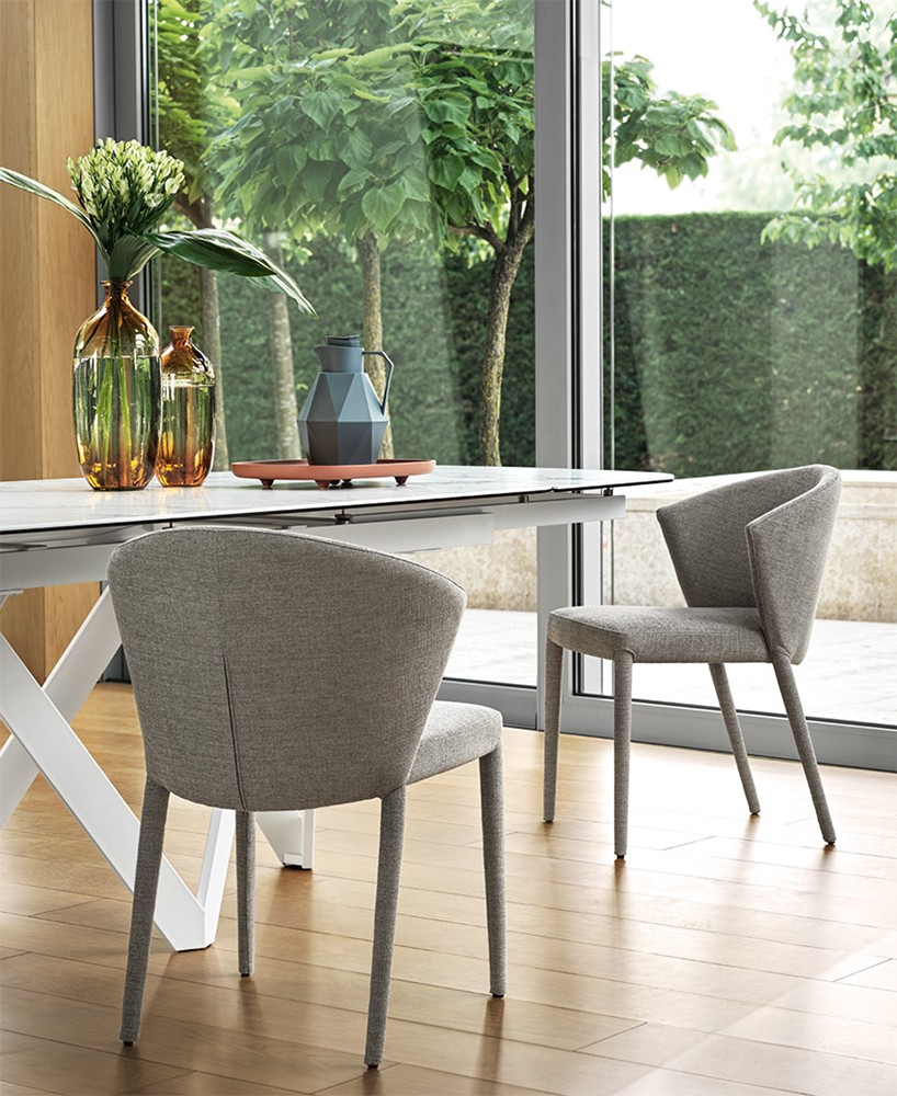 Amelie is a chair with smooth lines, and a unique and contemporary design. The large wrap-around backrest and the seat supported by elastic belts guarantee maximum comfort and softness.