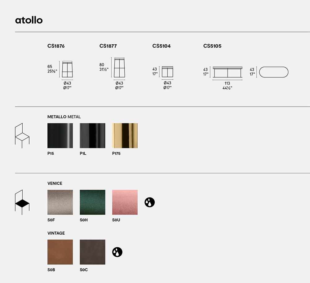 Atollo is an ottoman that belongs to the homonymous range made up of coffee tables, stools and benches. The circular seat cushion is padded and upholstered with decorative stitching. Its design and innate elegance make it a perfect addition to any setting.