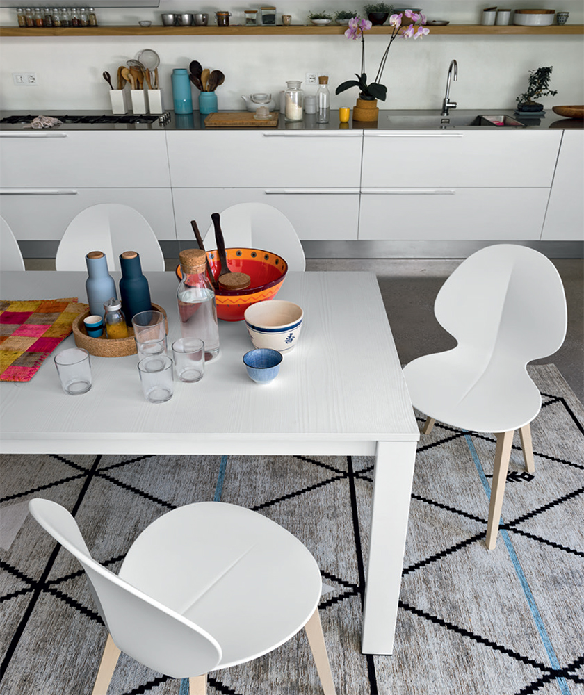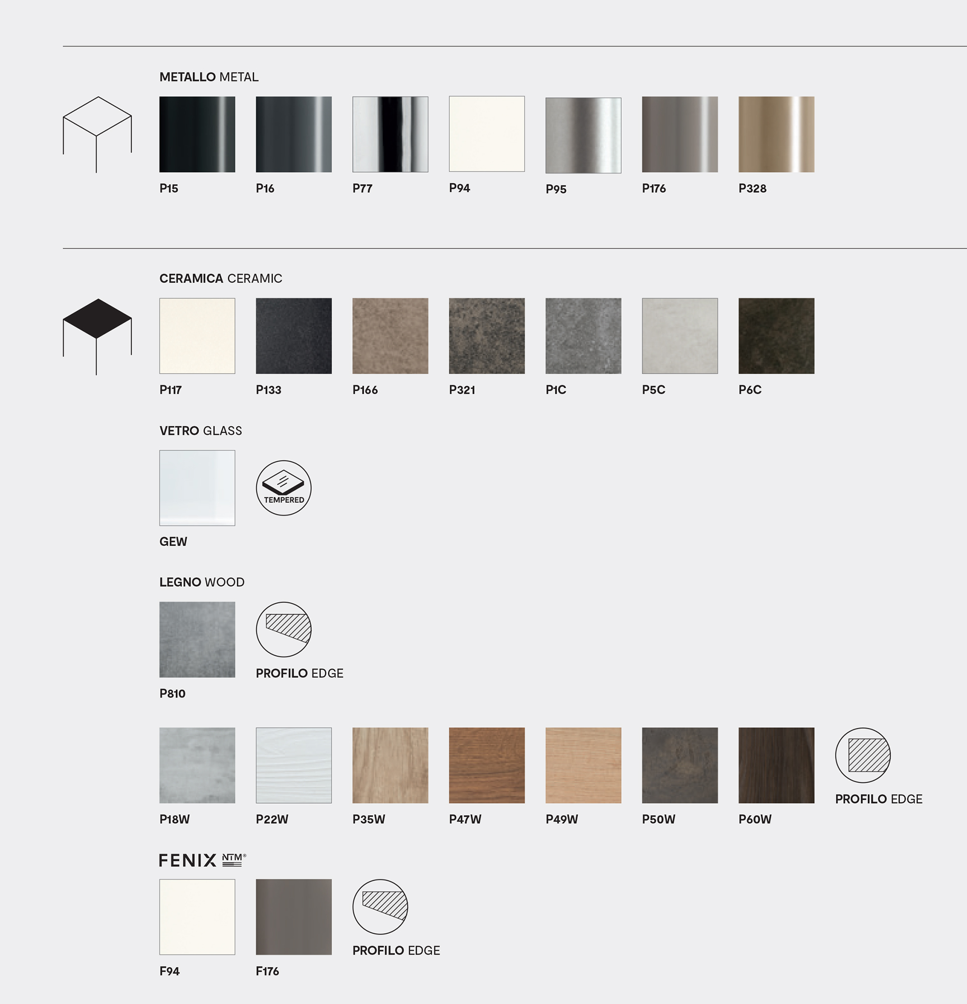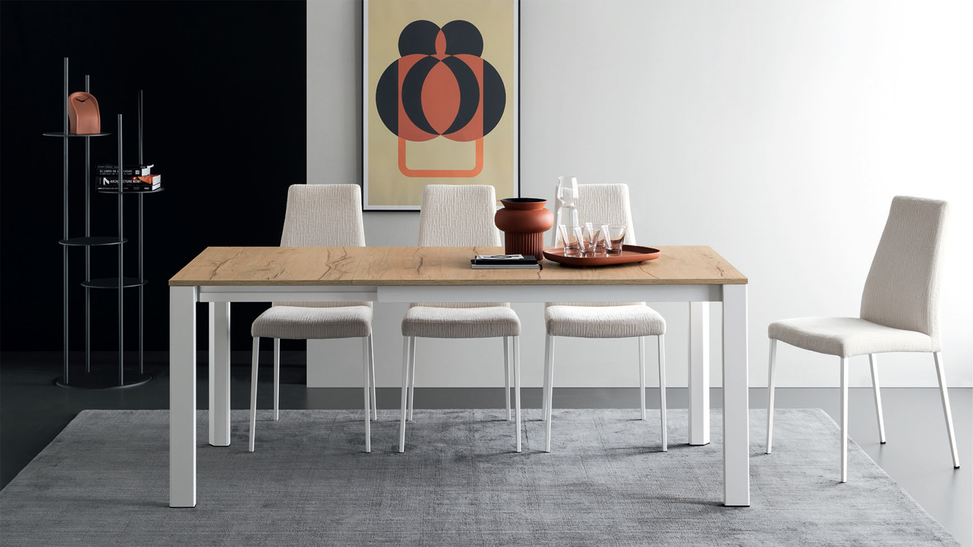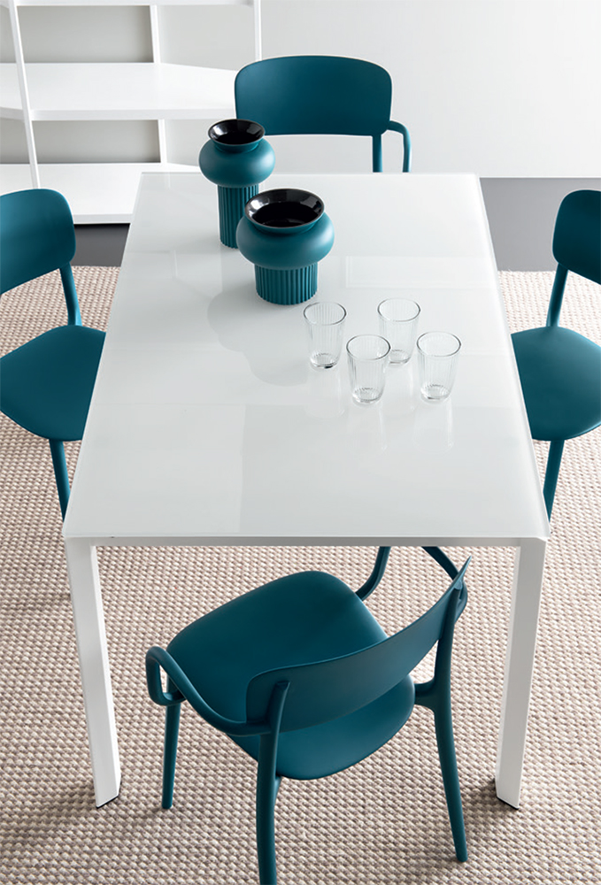 Non-extending Duca table: metal frame and top available in wood veneer, ceramic or tempered glass.