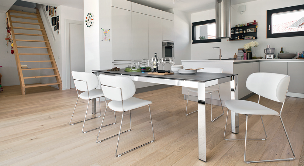 Simple and elegant, it has legs positioned at the corners for guaranteed sitting comfort. This table is an ideal way to elevate the dining area.