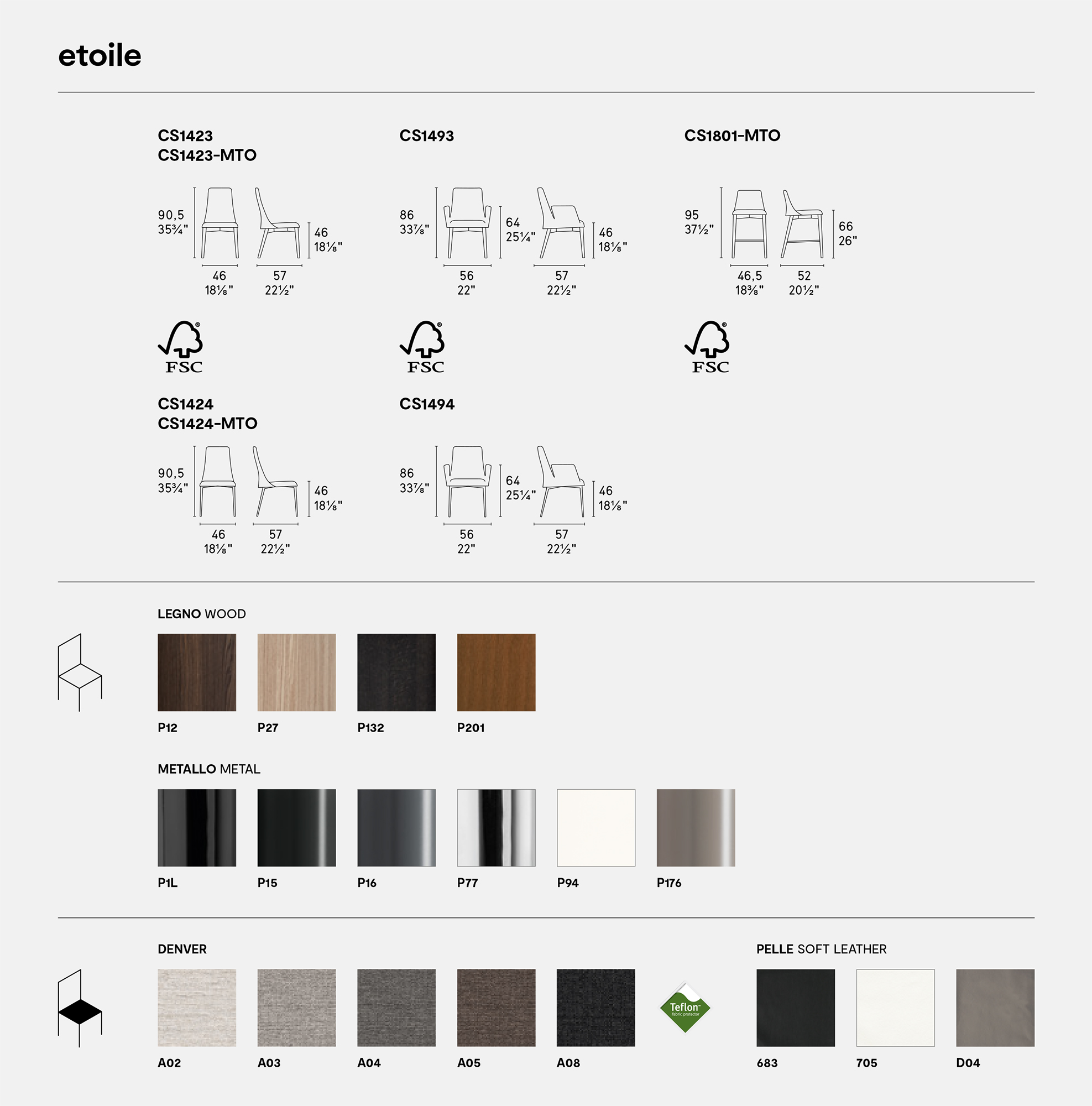 Model Etoile chair, with a frame in solid beech wood and upholstered and covered seat/backrest.
