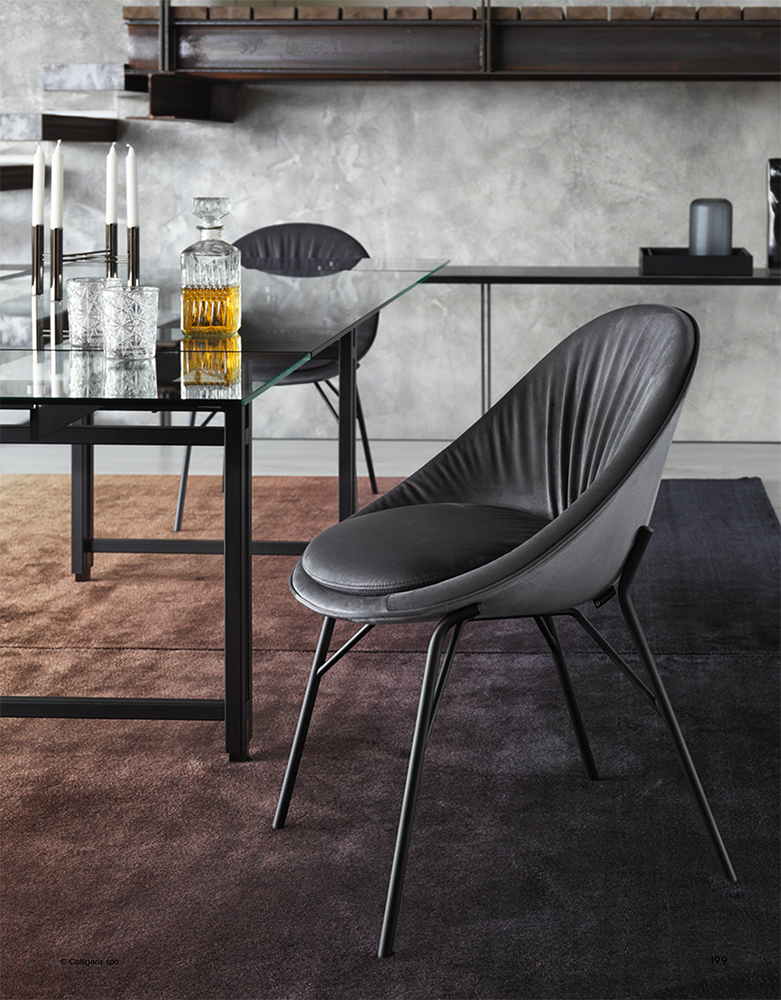 The seat shell, with its rounded forms and soft padding, is supported by a slender metal frame. The integrated cushion, matching with the seat shell, ensures the utmost comfort.