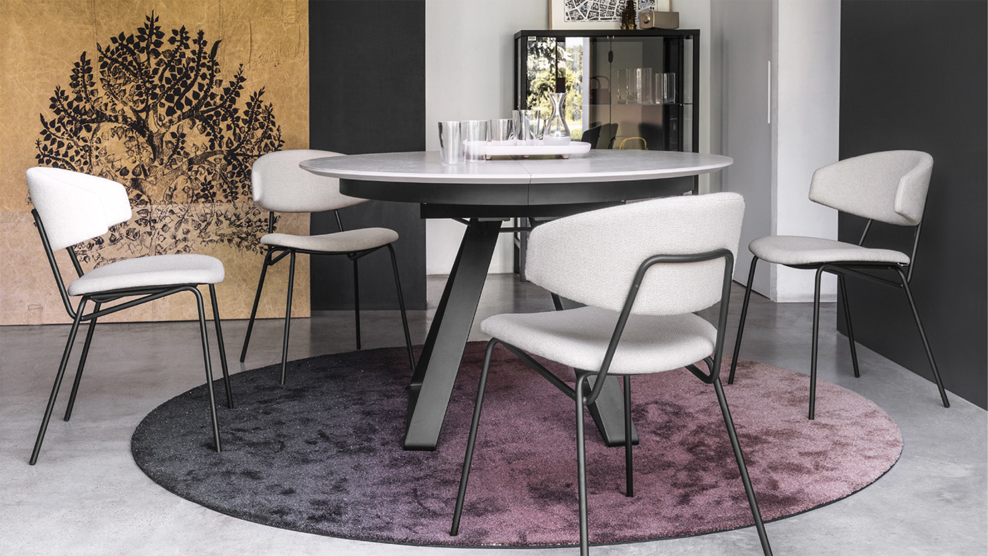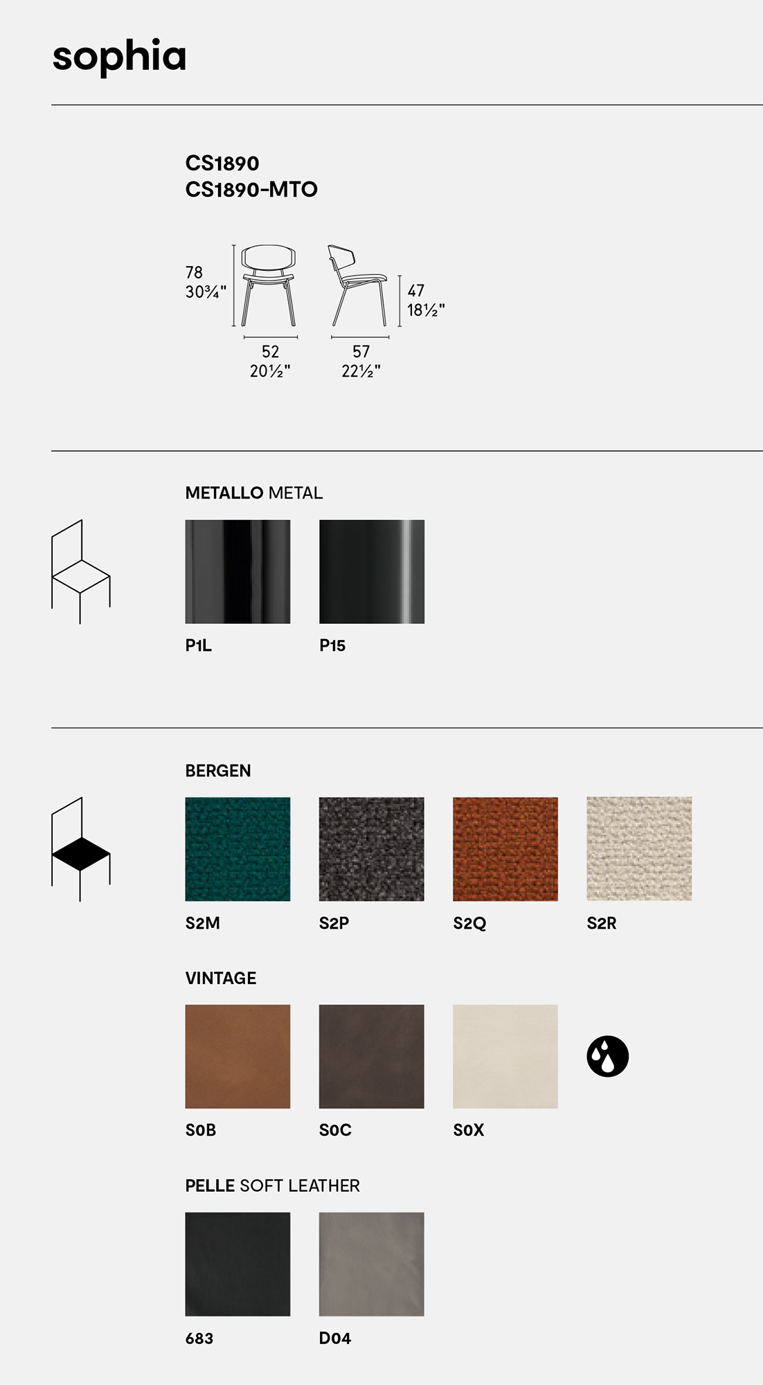 Its most striking feature is the sleek geometrical positioning of the two slender metal rods forming the frame to which the backrest and seat are firmly anchored. Both the backrest and seat come in plywood with padding and upholstered. A lightweight yet sturdy chair that will fit seamlessly into any setting.