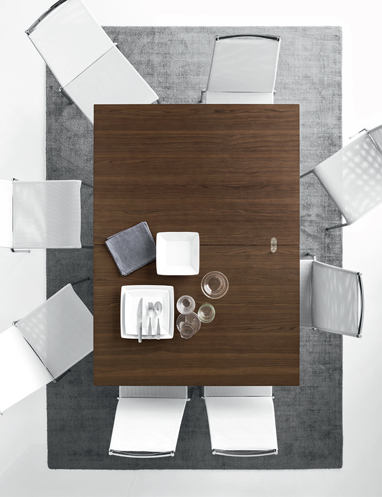This multifunctional table can be set to seven different height positions simply by pressing the release button and guiding it with one hand, thus transforming it from a coffee table to a dining table for eight people, thanks to the butterfly opening mechanism.