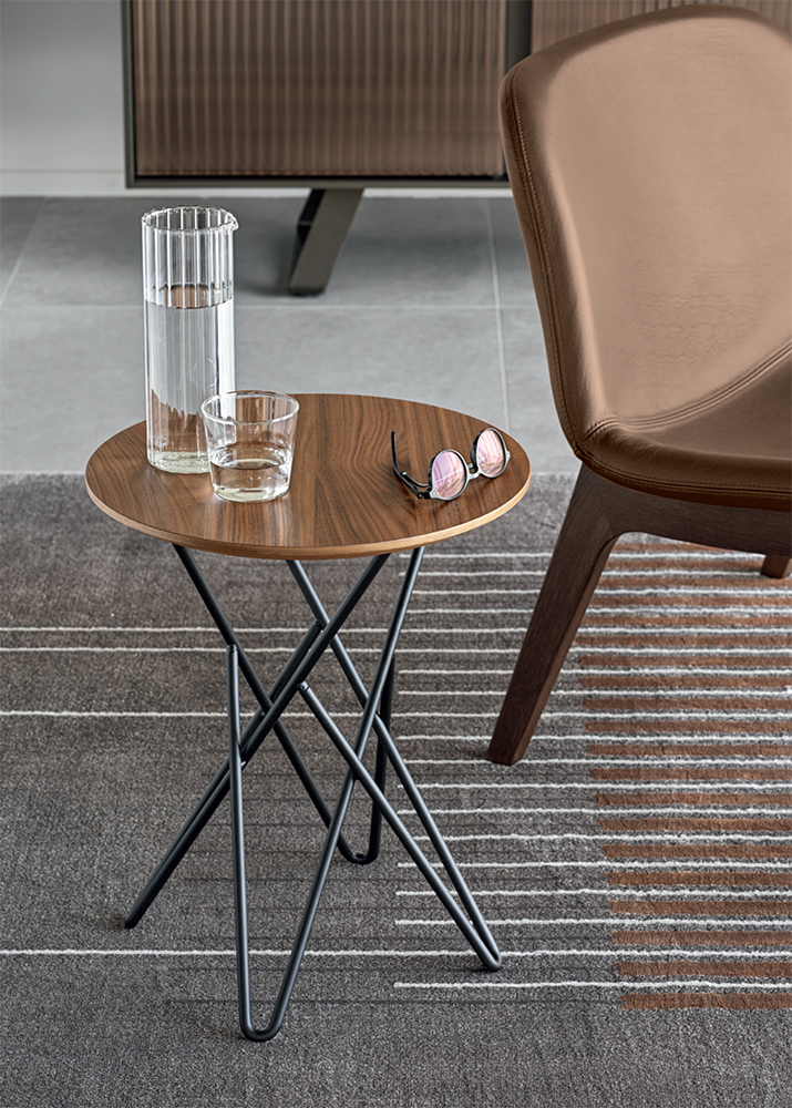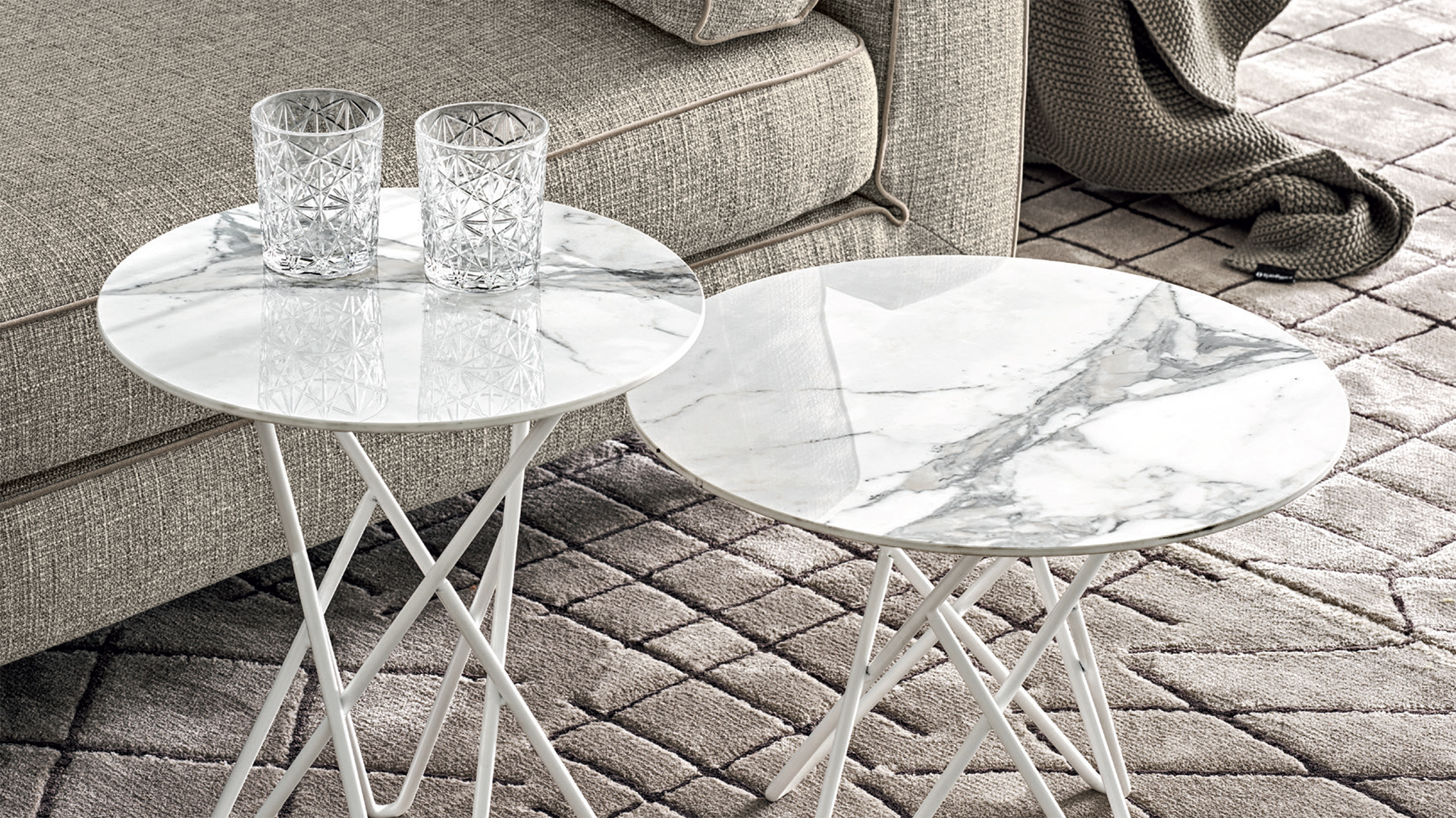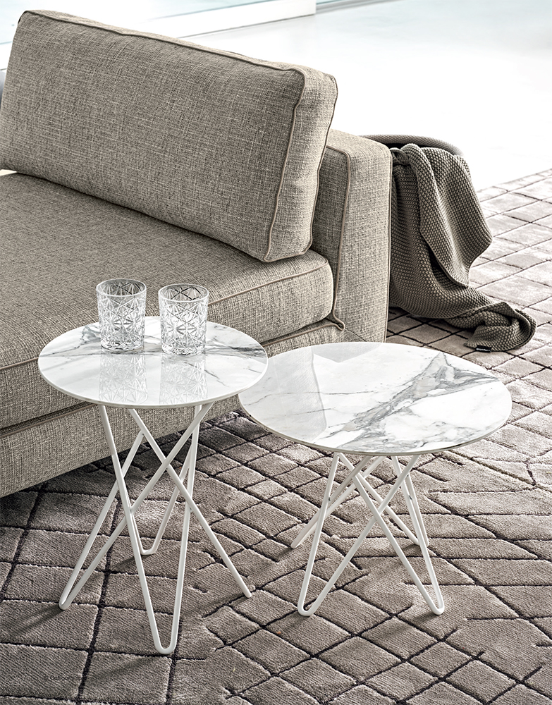 Coffee tables with a tubular-metal frame. Available in two heights and with two different ceramic or wooden table-top sizes.