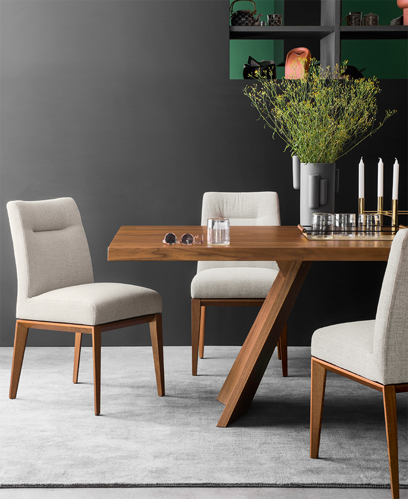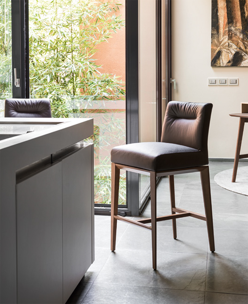 Triangular legs in solid wood. Seat fitted with elastic bands. Tosca is just as comfortable as a sofa, thanks to its extra soft fully upholstered seat. Suitable to decorate the dining room of your house or a restaurant, Tosca is synonymous with unrivalled comfort. Discover all the available combinations!