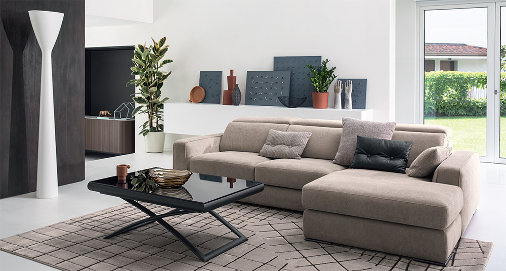 Simple and embracing lines for Cast, a sofa with pull-out seat, snap positioning movement and lateral chaise longue.