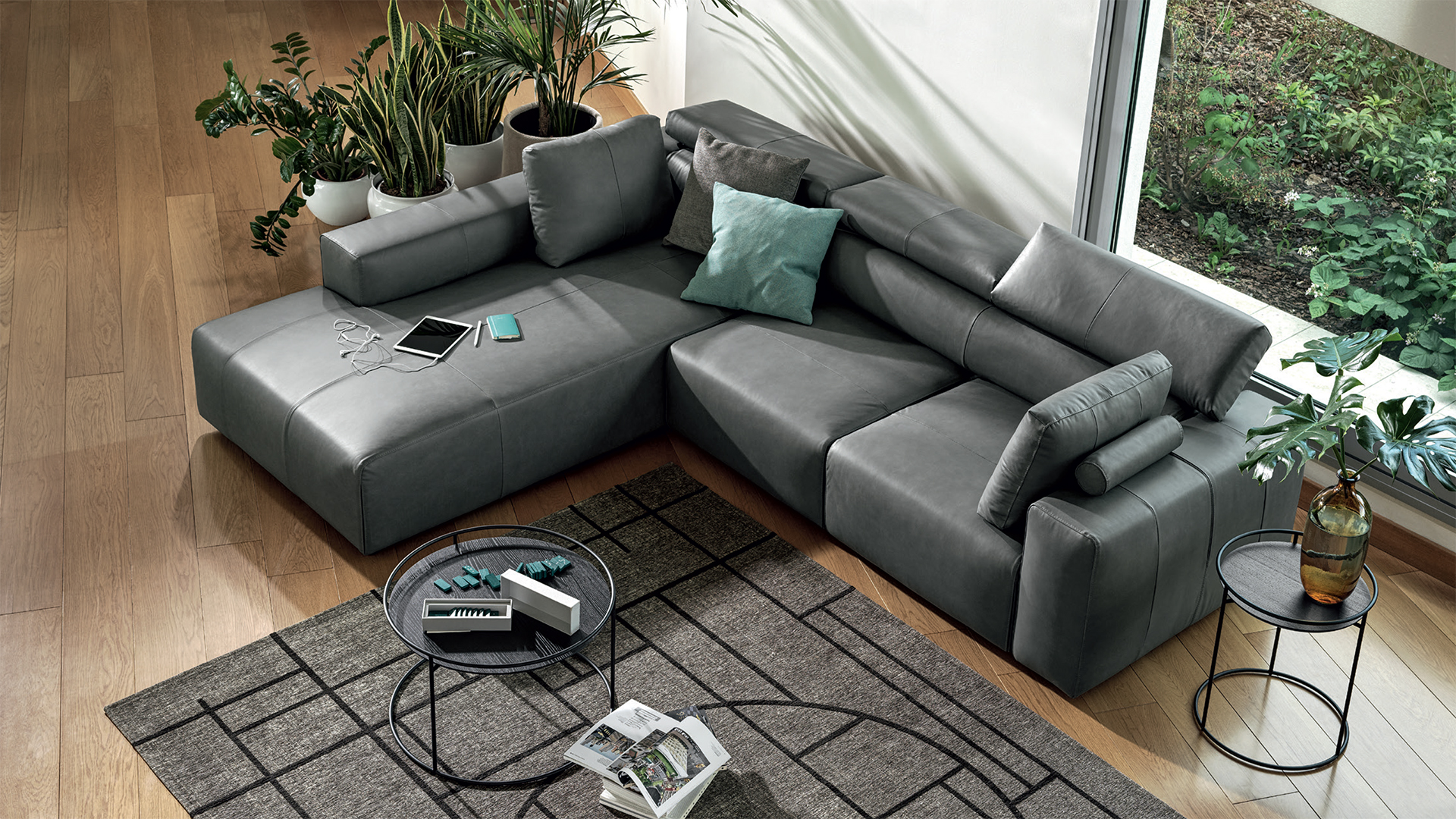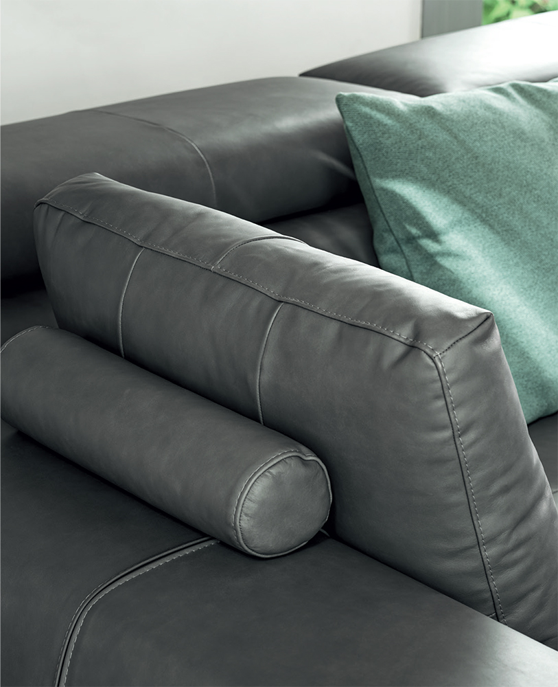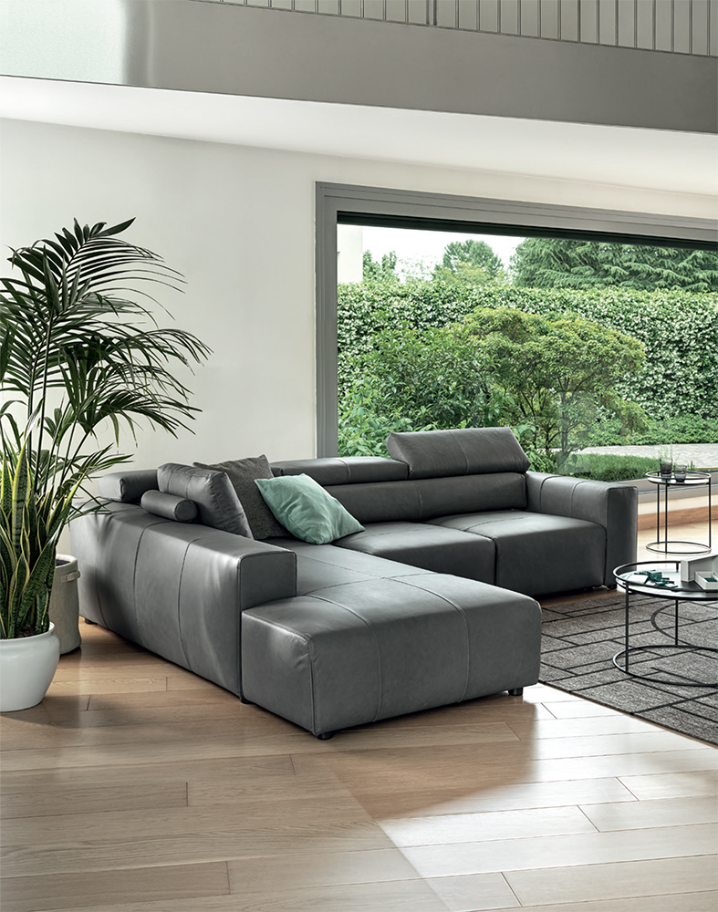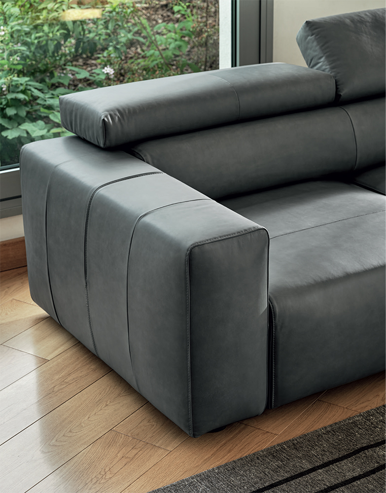 Cozy sofa with pull-out seat and reclining headrest. The deep seats have a rigid and regular design, are supported by hidden feet and lend Dado a strong and decisive character perfect to be lived in any living room.