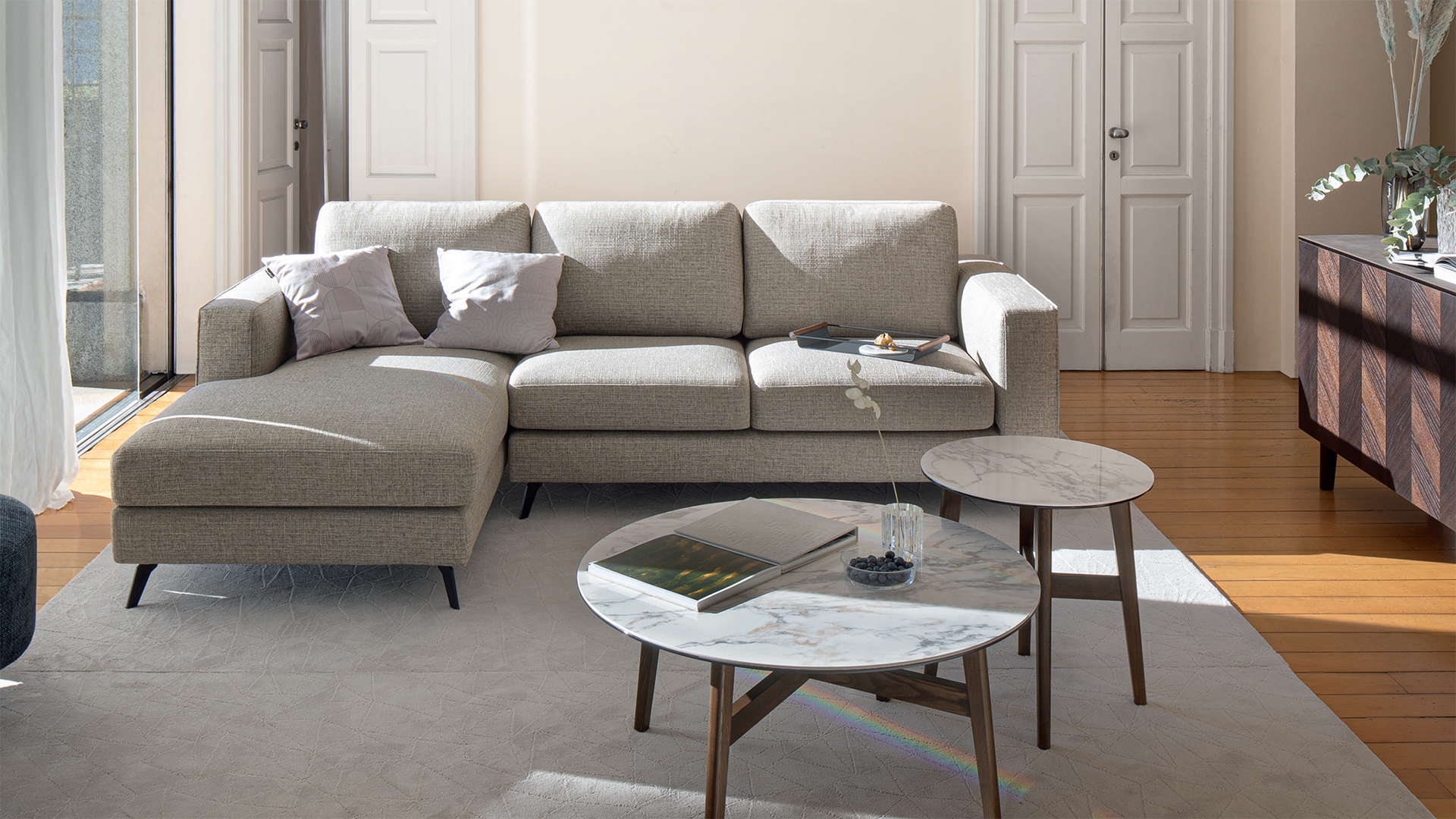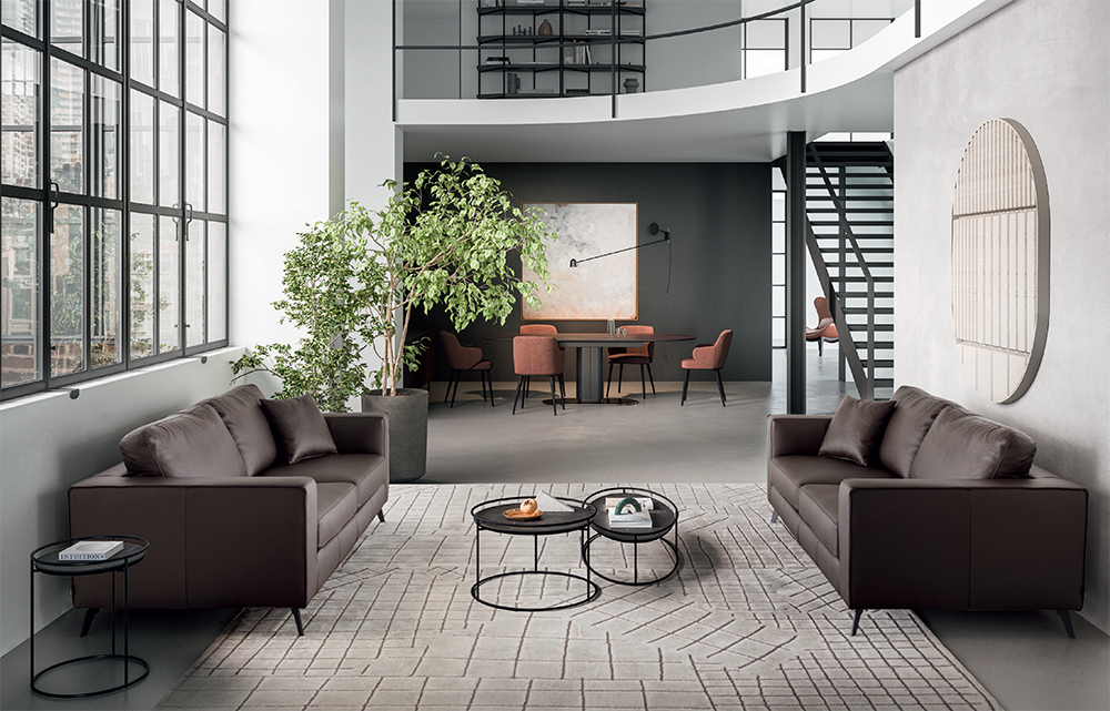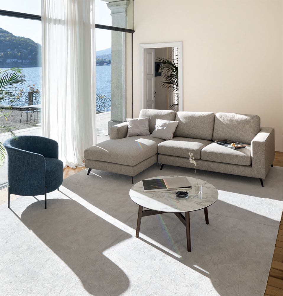 Minimalist sofa with geometric and strong shapes, suitable for contemporary environments. Square next, the evolution of a best seller from the Calligaris collection, has a modern character thanks to its bold lines and its characteristic black “blade” foot. The model is made with soft cushions in polyurethane foam and feather and is offered both with removable fabric and leather in a full range of sizes and modular solutions.