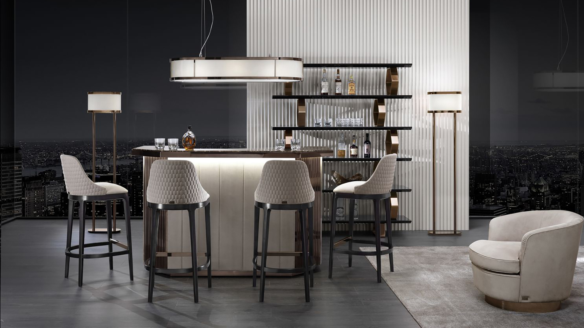 Chair with quilted back. The base is made of stainless steel. The height of the chair can be adjusted.