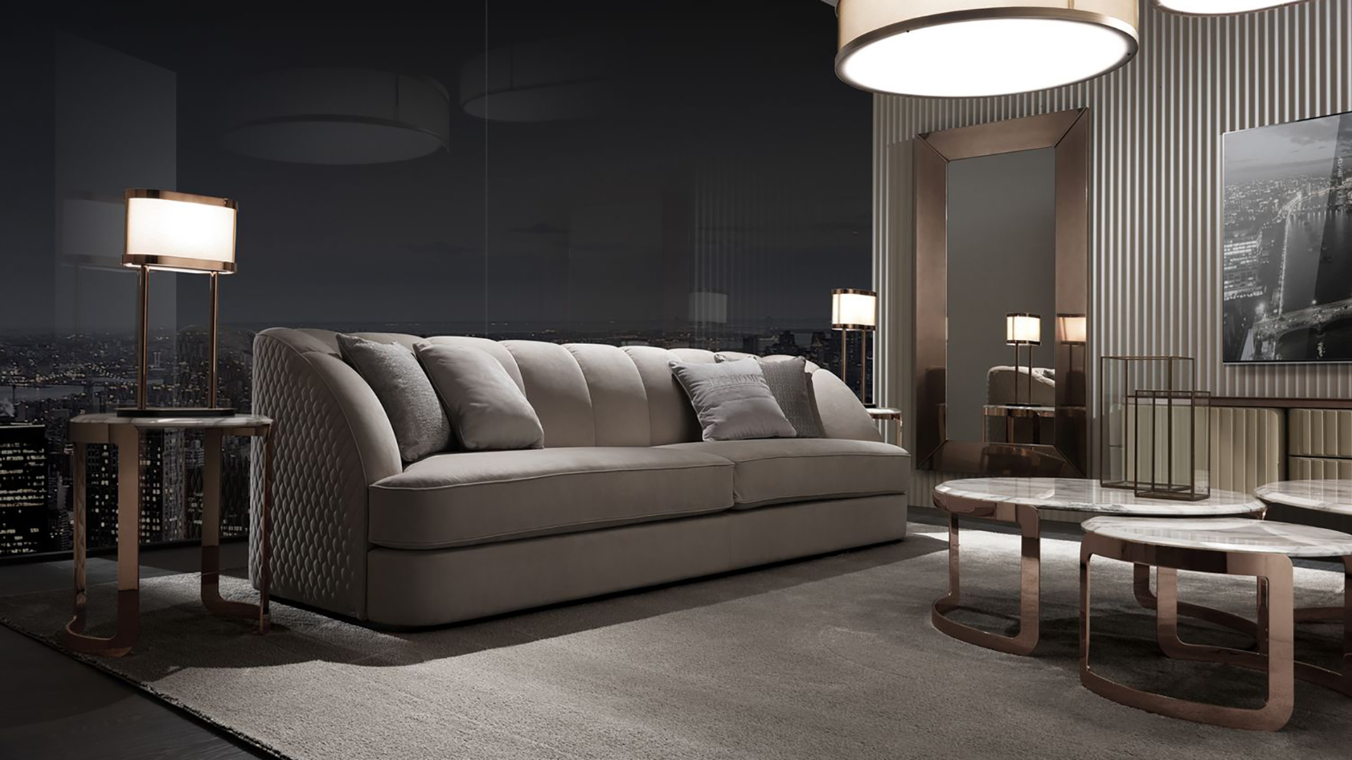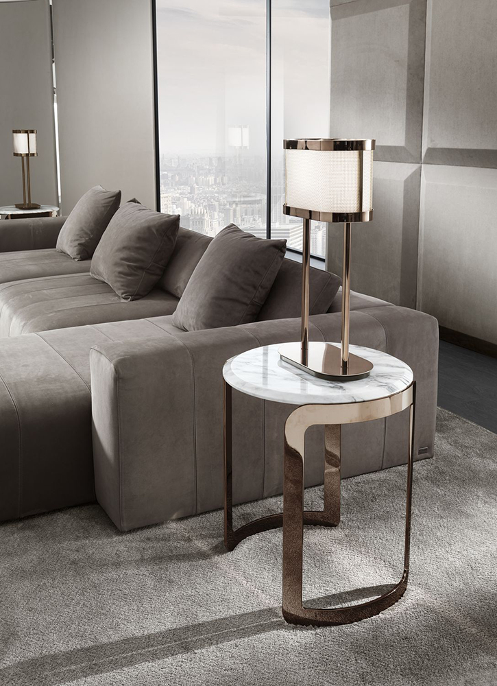 Coffee table Coco is an unusual piece of furniture. The main detail in it is a round marble tabletop. It is supported by two radius support legs made of polished brass. They have a see-through design that creates an almost tangible volume at the base of the table.