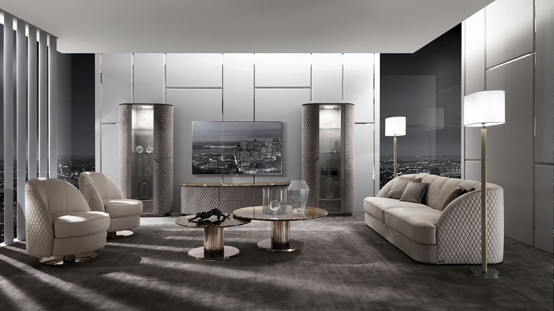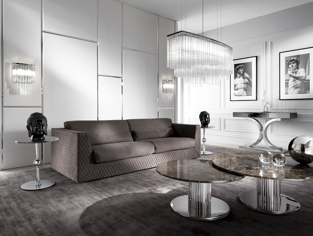 Coffee table with round top and metal base. The tabletop can be marble, wood or leather upholstered. Other finishes are possible.