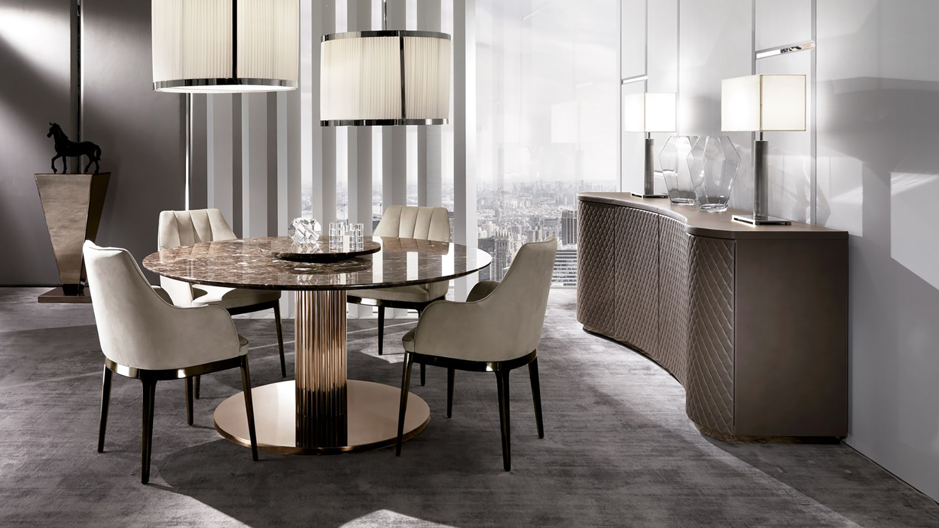 Dining table with round wooden top and metal base. Table with marble top available. Other finishes are possible.