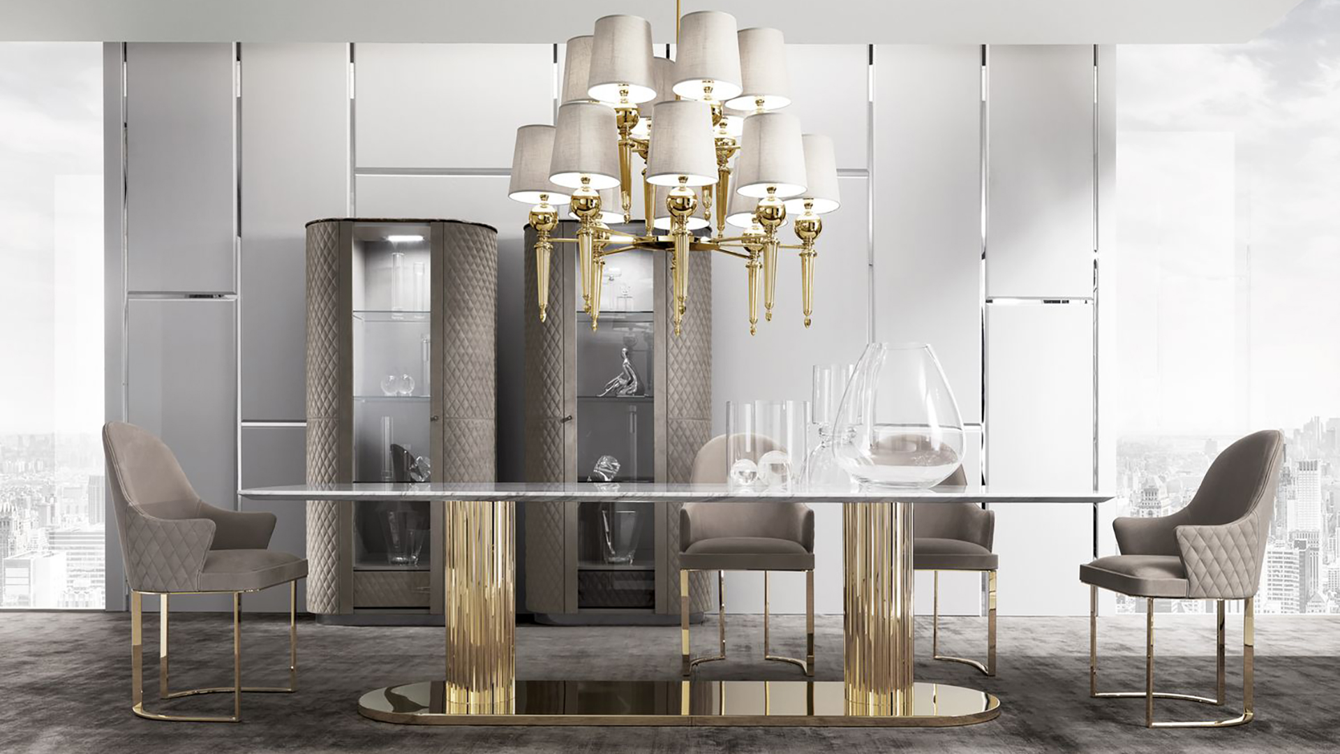 Dining table with oval marble top and metal base. A table with a wooden top is also available. Other finishes are possible.