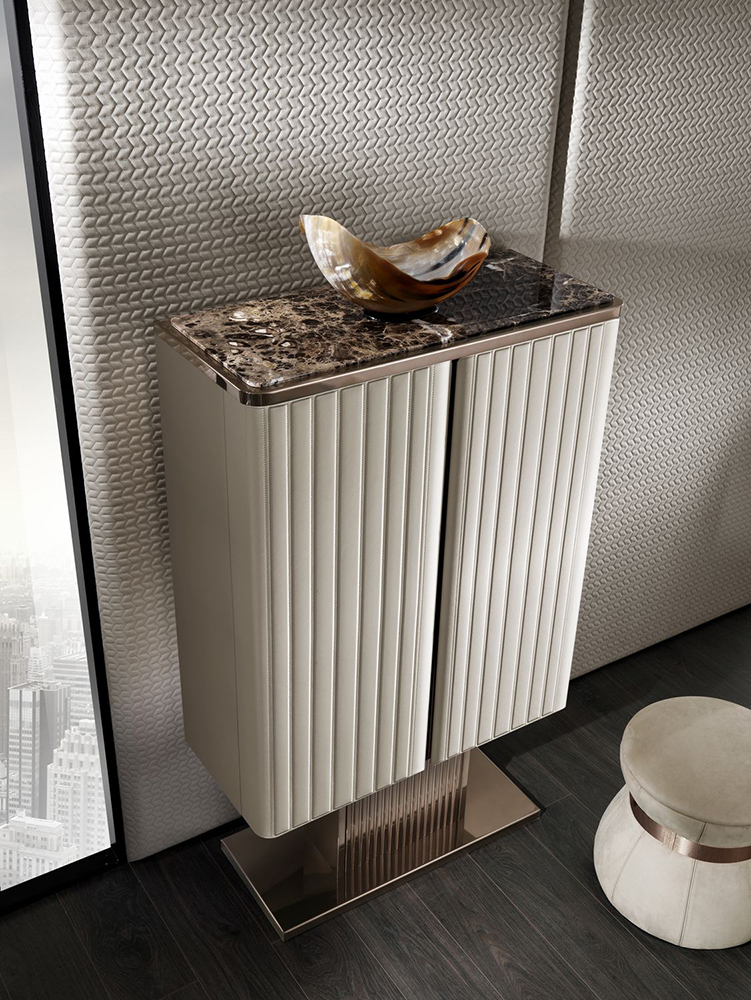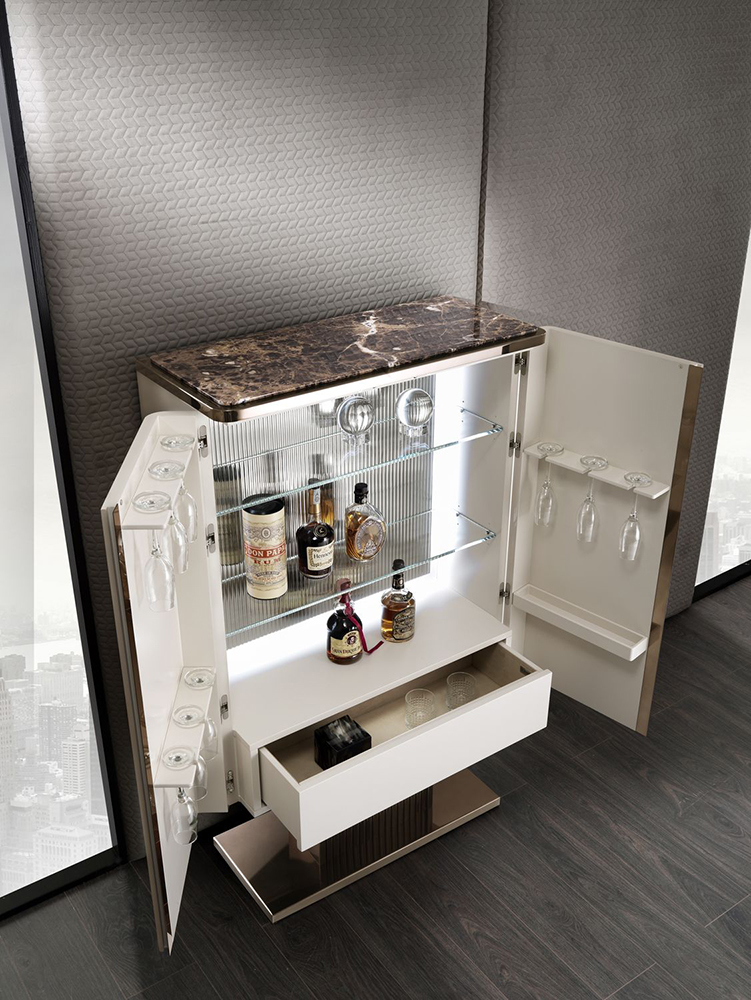 The Elite Bar maintains the concept of elegance inherent in the entire Elite furniture collection. A wide variety of materials are used in its decoration, some of which differ in their characteristics. The filling of the cabinet has transparent glass shelves, spacious drawers and comfortable interior lighting.