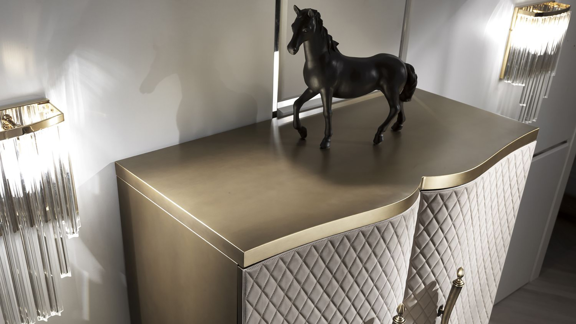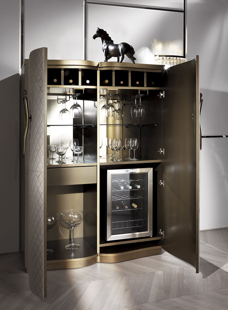 Spacious and functional bar. The body of the model is made of MDF, the base of the furniture is made of solid steel, and the top is made of natural wood. All external surfaces are decorated with matte or glossy varnish. The interior design includes a number of niches and drawers for comfortable storage of dishes and drinks. The back wall of the model is decorated with mirror glass. The designer bar harmoniously combines classic and modern features, which makes the furniture versatile.
