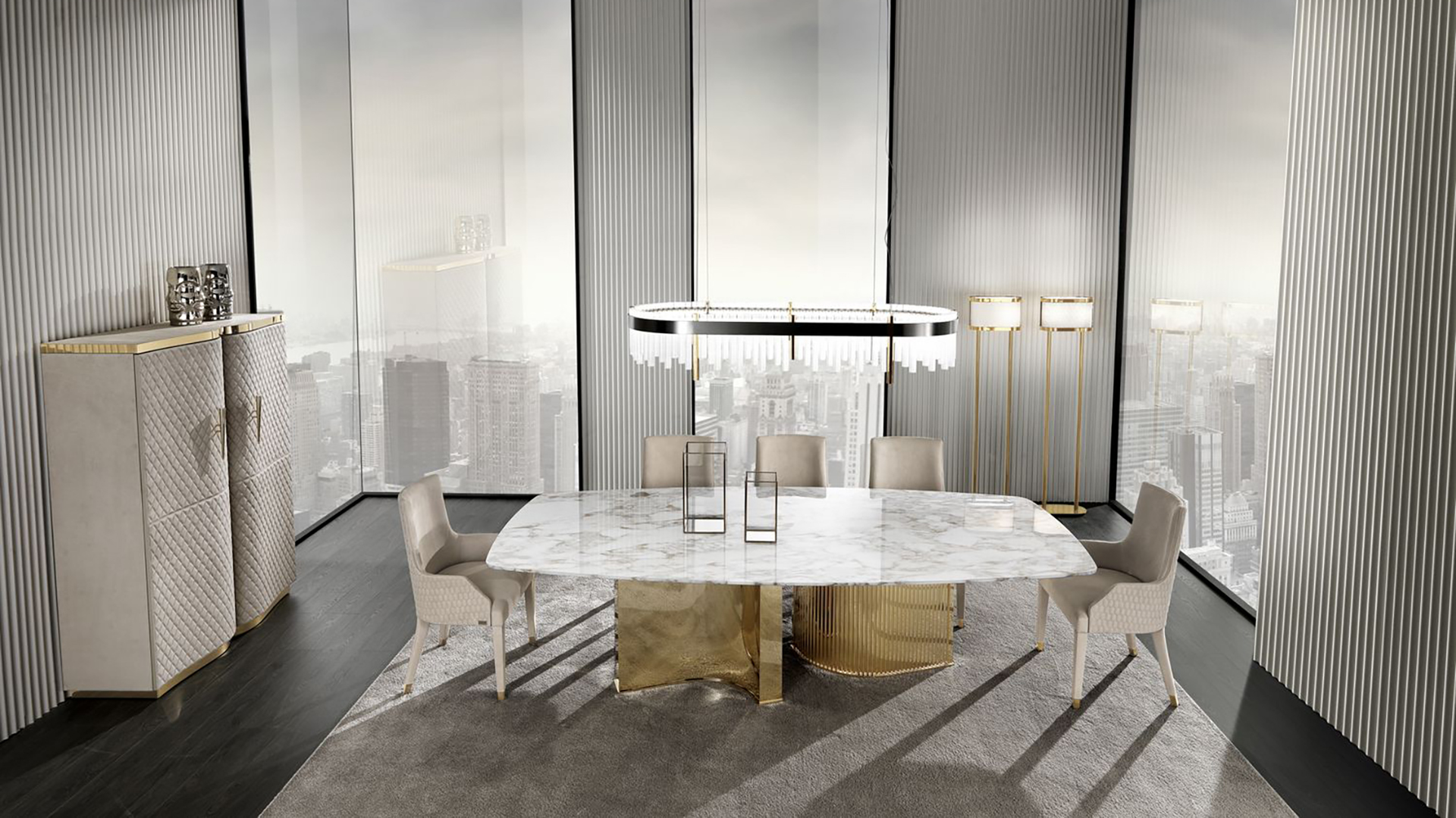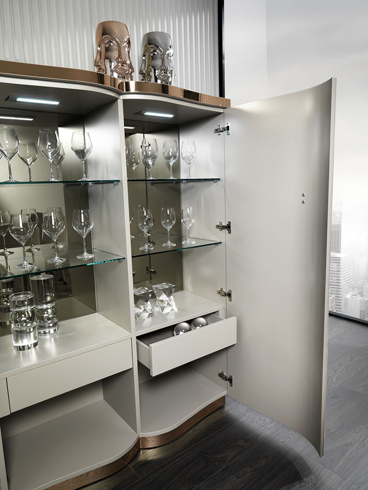 Bar cabinet with two figured hinged doors in leather upholstery. The base is made of metal. Equipped with lighting, two glass shelves, mirrors and two drawers. Other finishes and upholstery options are available. Also, you can additionally convert the cabinet: install a refrigerator, holders for glasses and compartments for storing drinks.