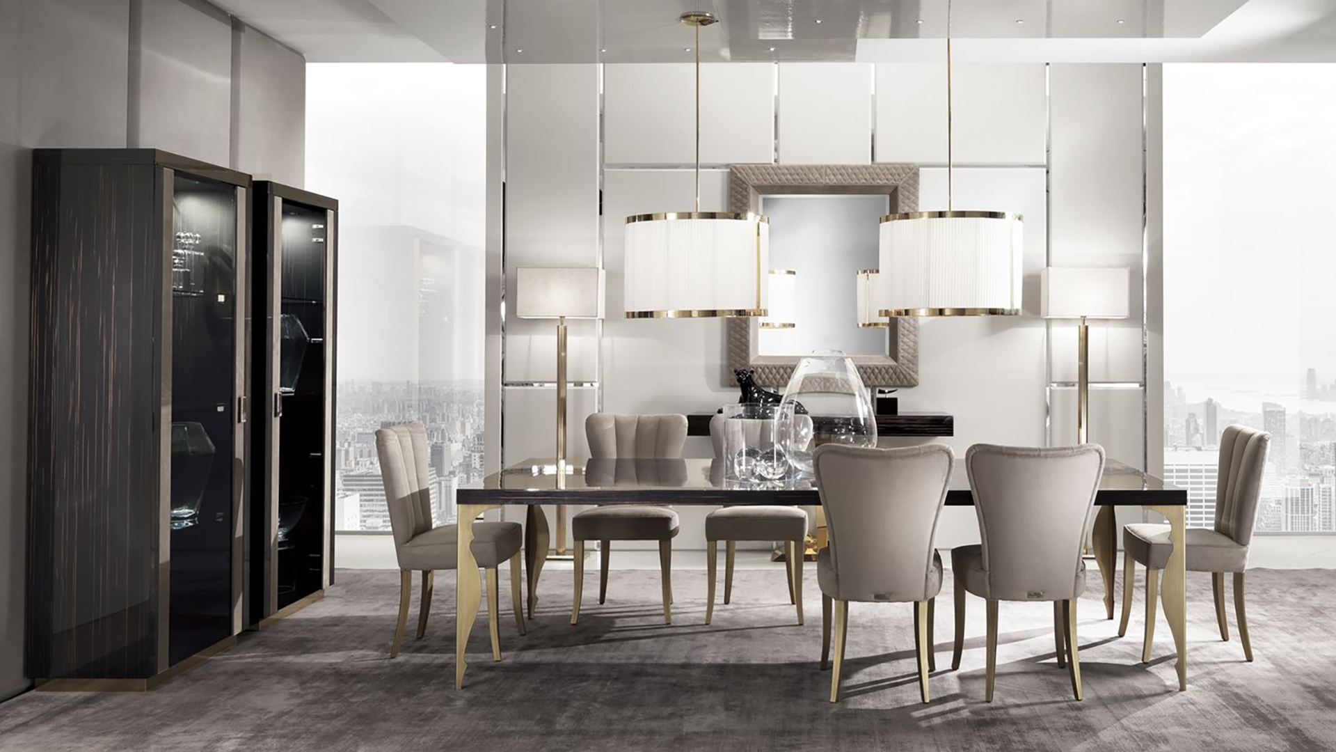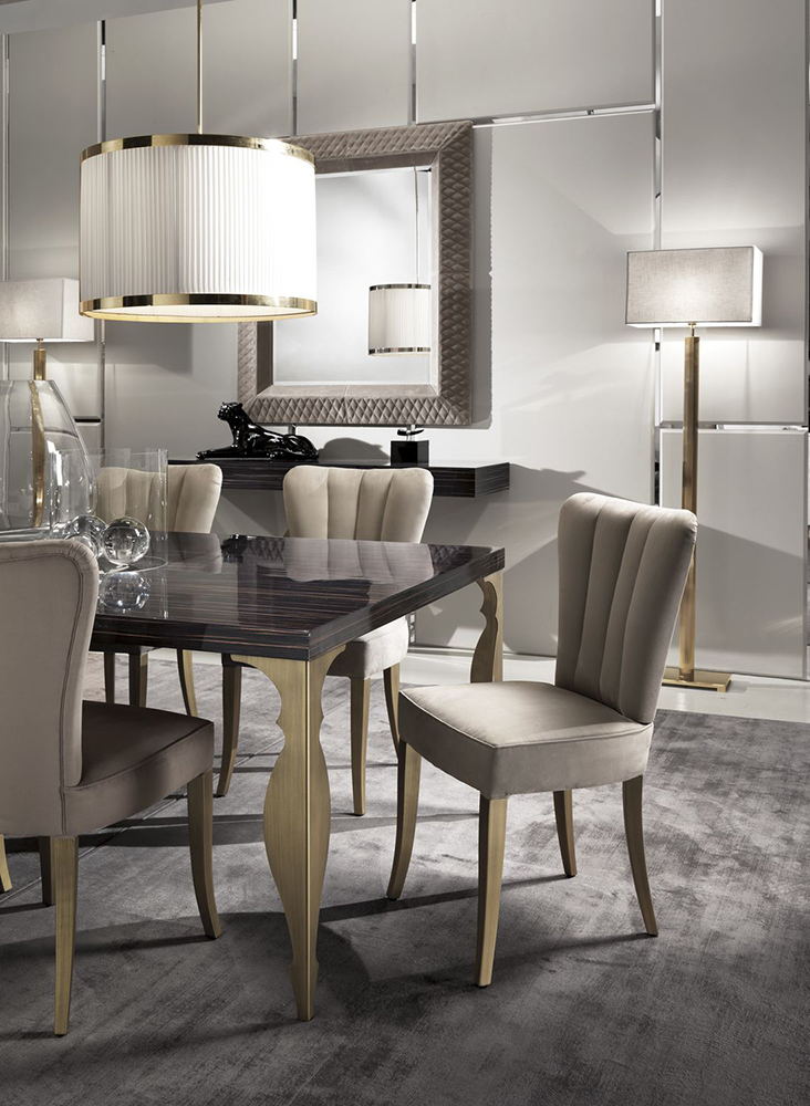 Dining table with rectangular wooden top and shaped metal legs. Other finishes are possible.