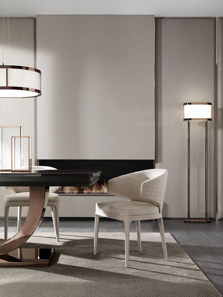 Extensible table on a stainless steel base. The tabletop can be made of different types of wood (in MDF and solid wood) and marble. Other finishes are possible.