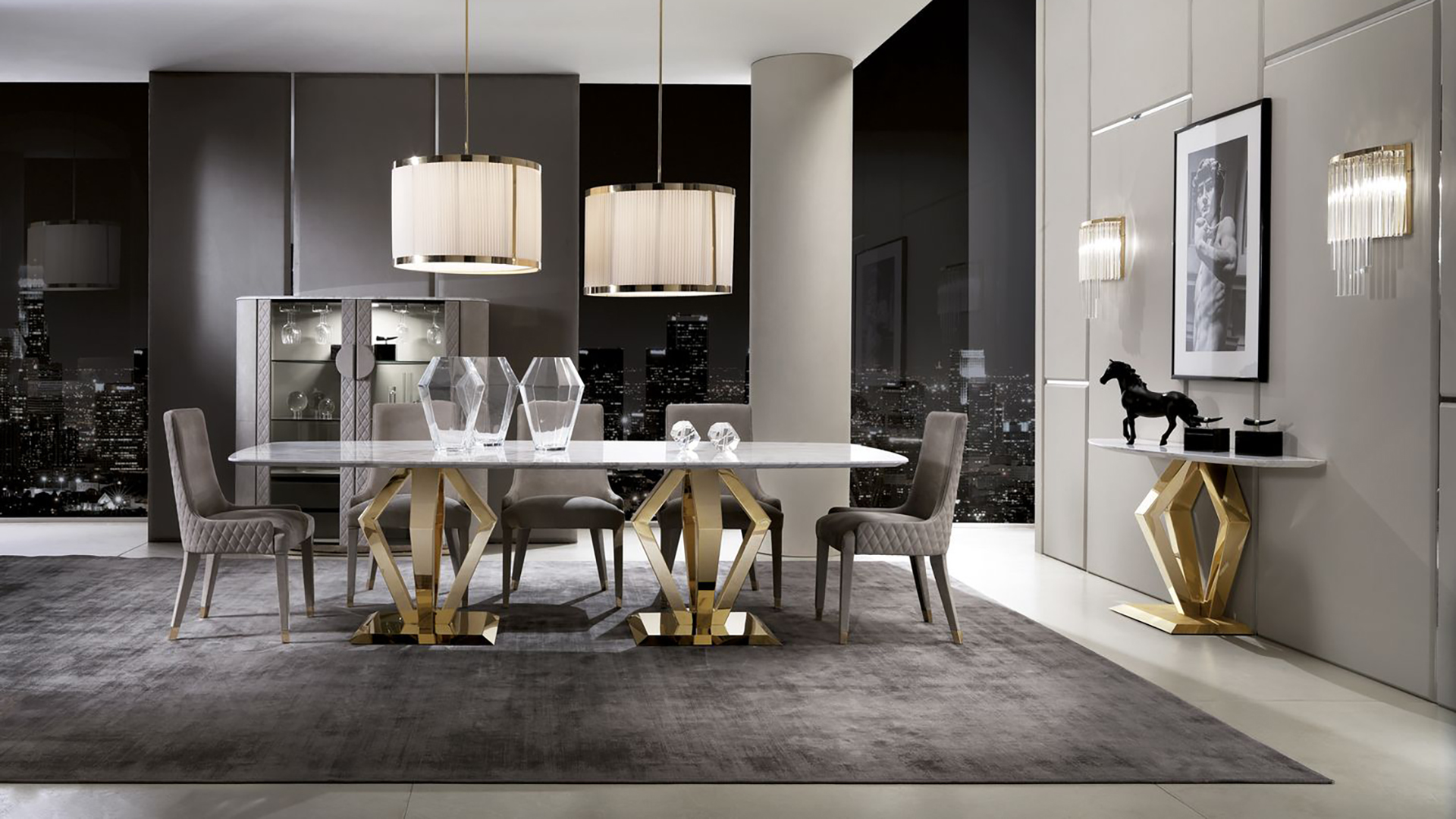 The console on three supports Ritz will fit into the interior of the living room or bedroom. Rectangular tabletop with rounded corners is made from a solid marble slab, which has a natural, natural pattern. The support consists of three metal legs that bend at an angle, forming an unusual shape.
