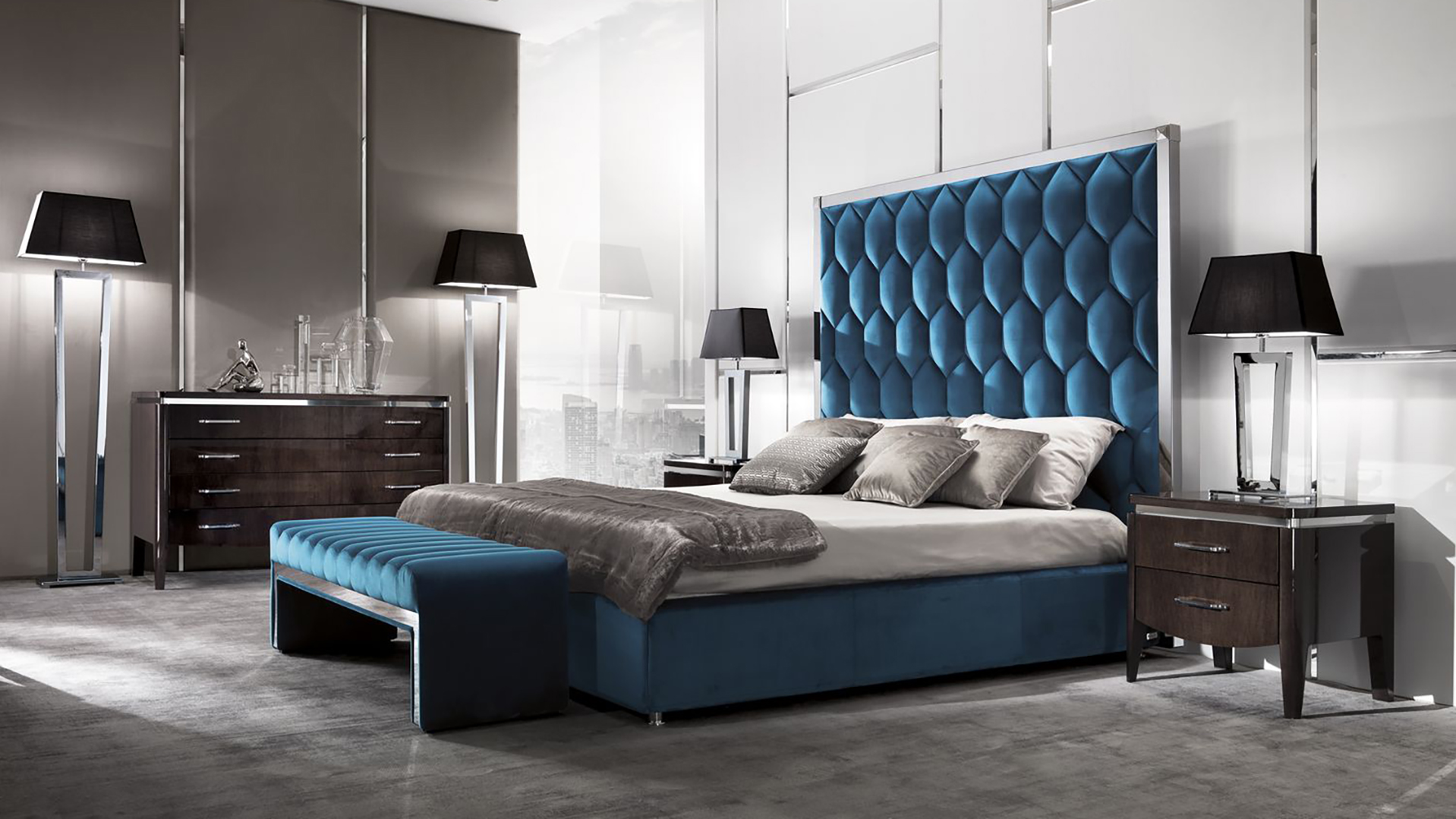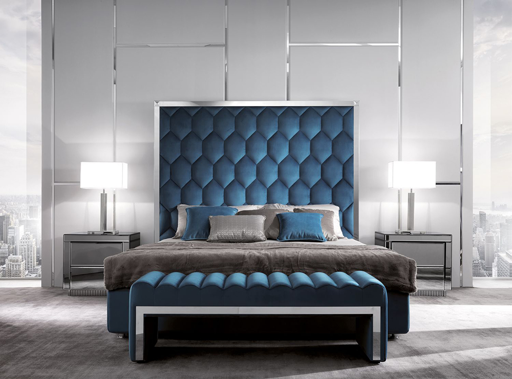 Envy`s silver framed bed is crafted in an original Art Deco style. Neat metal legs, covered with a silver coating. The high headboard is framed by a border with a noble sheen of silver. The rhombus-shaped quilted headboard finish makes the model a good solution for furnishing a bedroom. Various finishes and colors are available.