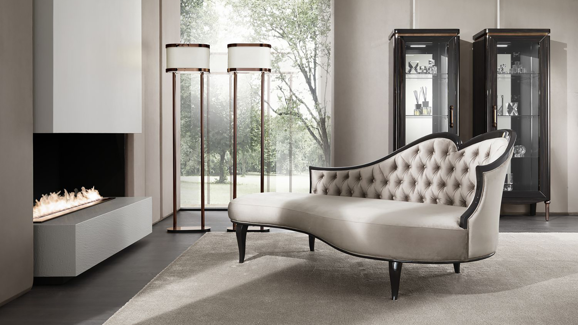 Rene chaise lounge from the factory will be a great alternative to a sofa in an executive space. It is equipped with an asymmetric back, the upper edge of which seems to be drawn with a bold, confident line. Along all the edge lines, the ottoman is surrounded by a curly frame. The seat is also asymmetrical. The structure is supported by four cabriole legs, tinted to match the color of the frame.