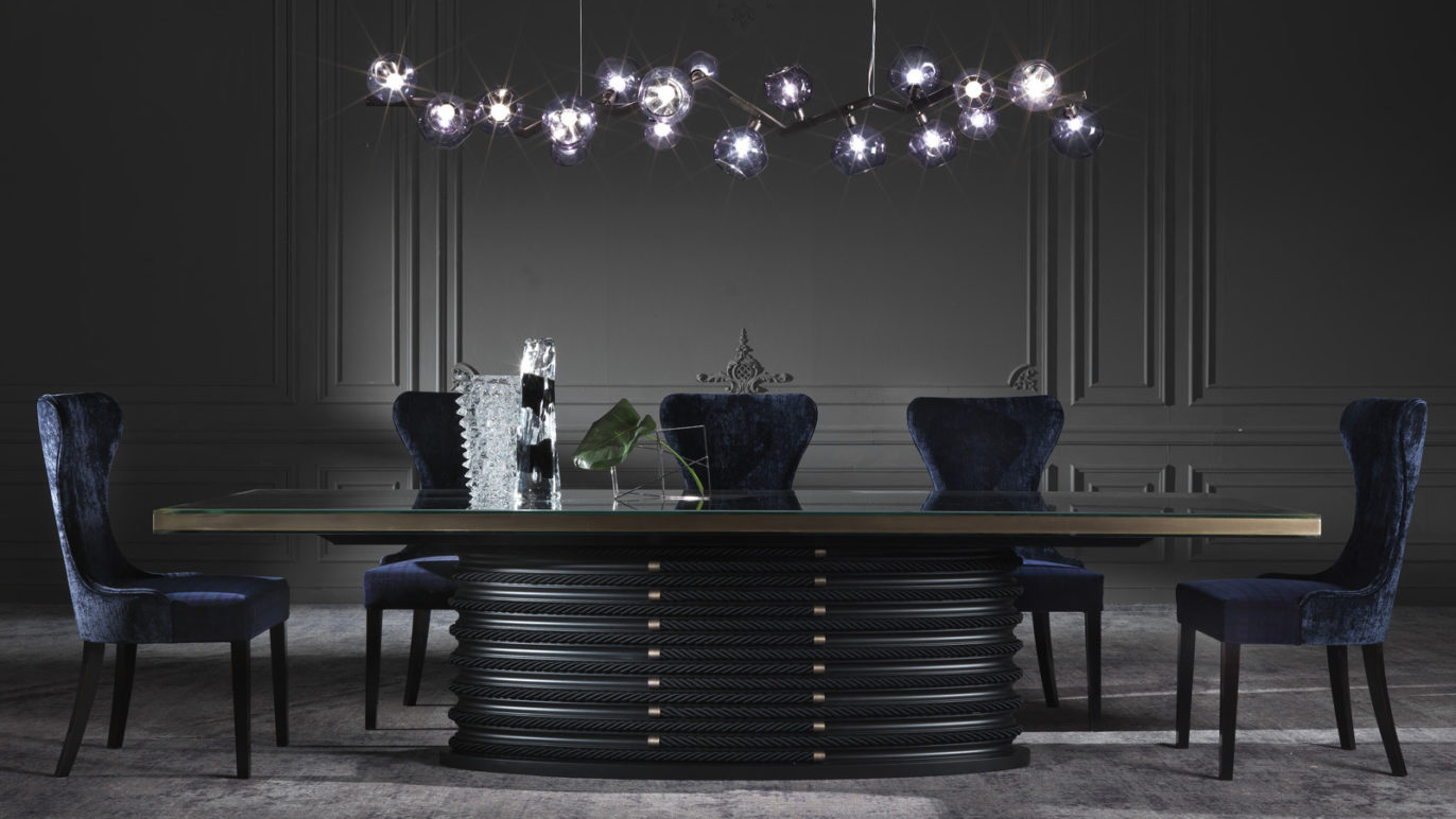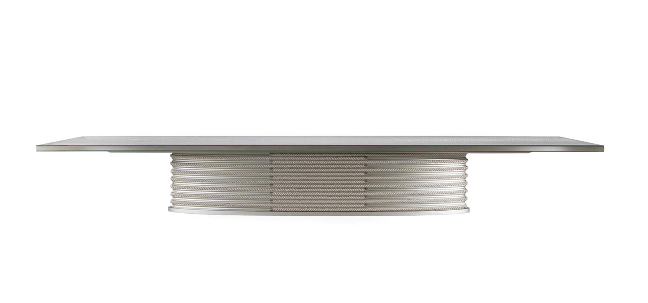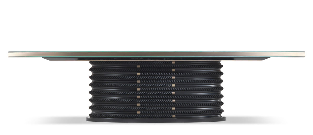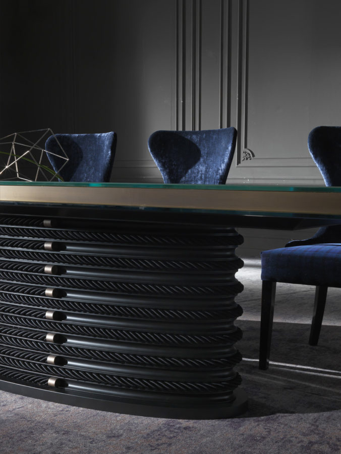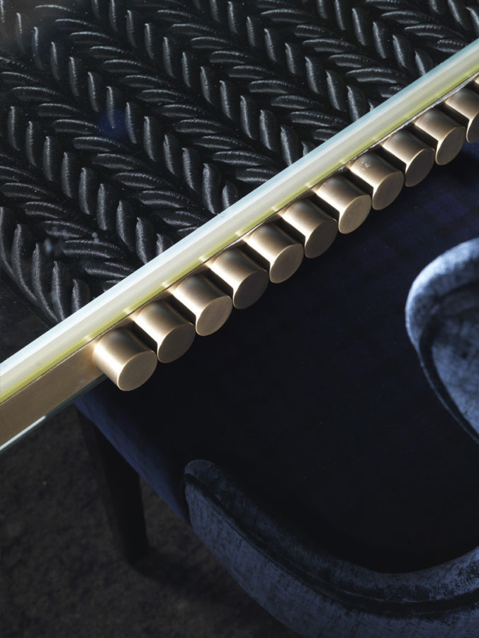 Majestic and imposing, Brick Lane dining table is characterized by the presence of ropes, visible through the wide glass top placed on the wooden base. The rope, a typical decoration of the classical world, is combined with brass elements to create a special graphic game that recalls the shape and materials of the hussar jackets. A style detail recounting the ability of Gianfranco Ferré Home to translate the classic style archetypes in a modern version, creating “a-temporal” furnishings carriers of a universal language able to seduce customers coming from different cultures and lifestyles.