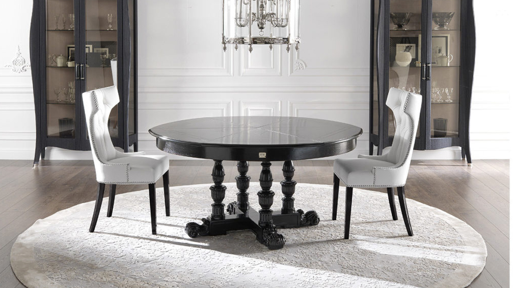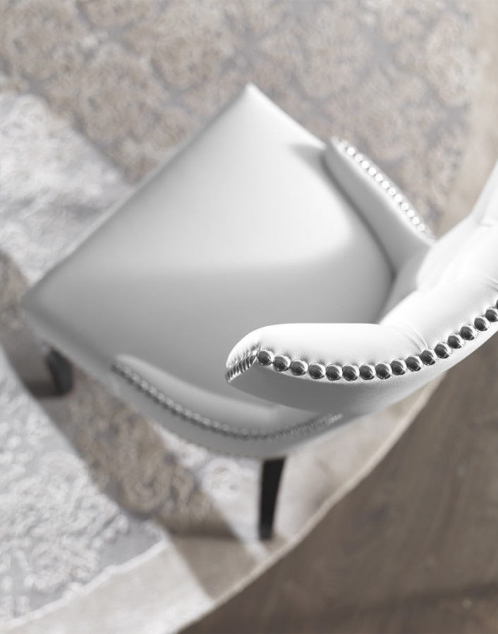 Structure in beech wood and foam. Upholstery in leather cat. A | L.04.01. Legs in black lacquered finishing or mahogany finishing. Ornamental metal nailheads.