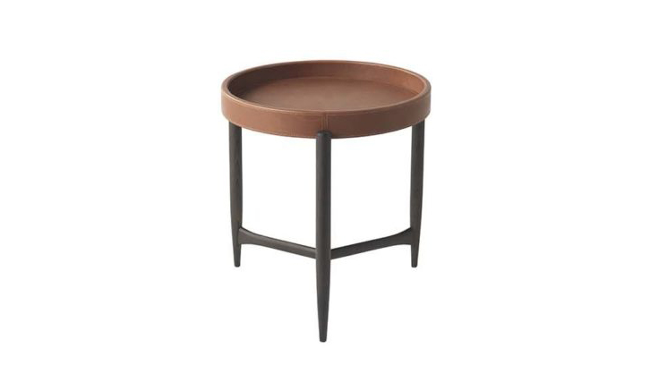 Round top with removable tray in MDF, covered in cat. C leather Vintage L.09.02 Natural Saddle with visible stitching.