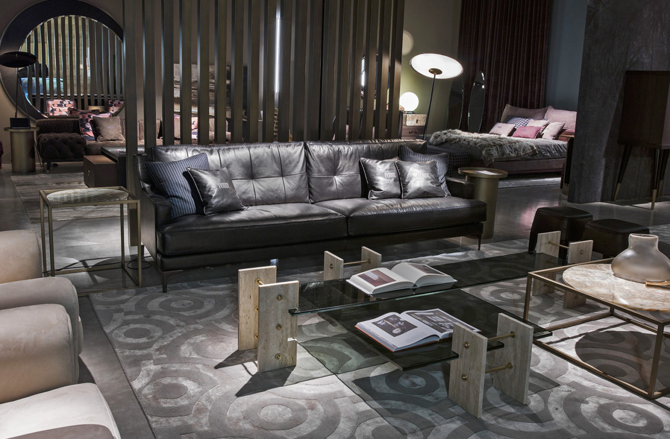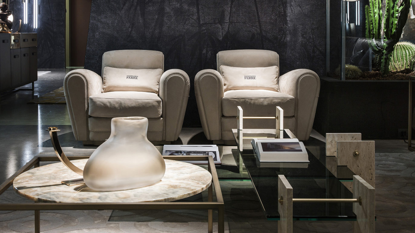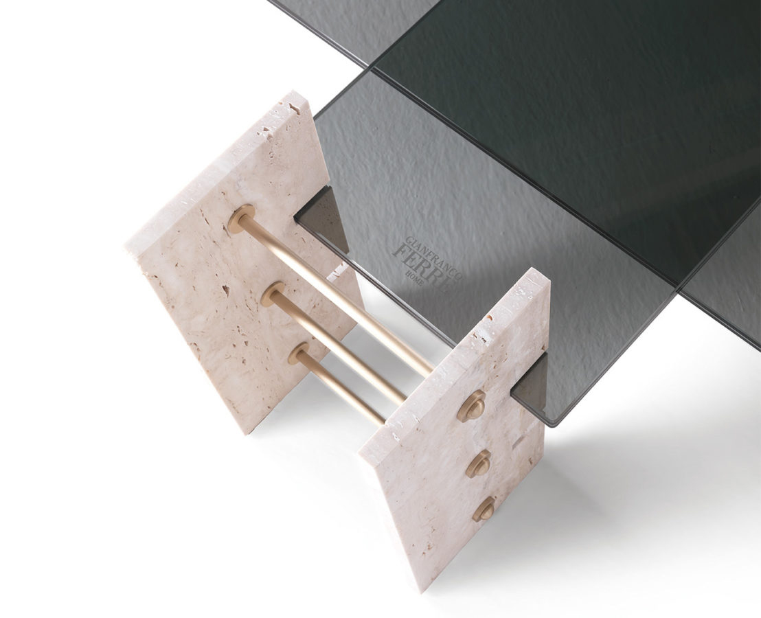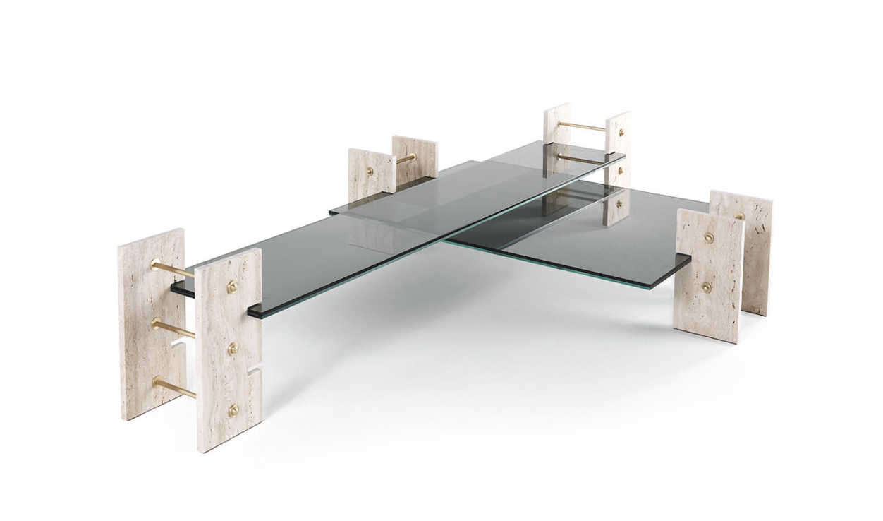 The Fitzroy line, consisting of bookcase, console and coffee tables, epitomises the industrial style which runs throughout the collection. These pieces, with a 1970s feel, recall the shape of the mechanical devices and are made of travertine, brass and smoked glass.