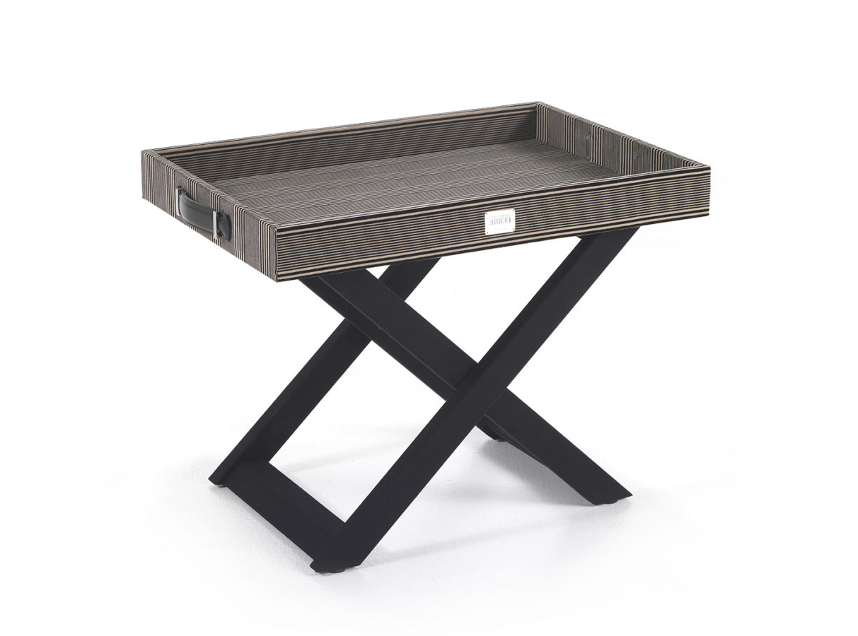 Side table with tray. Base in beech wood covered with black microfibre. 2 leather handles. Tray in multi-layer poplar covered in fabric cat. A | L.14.25.