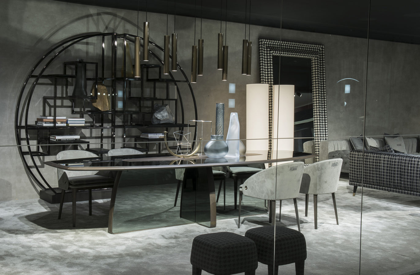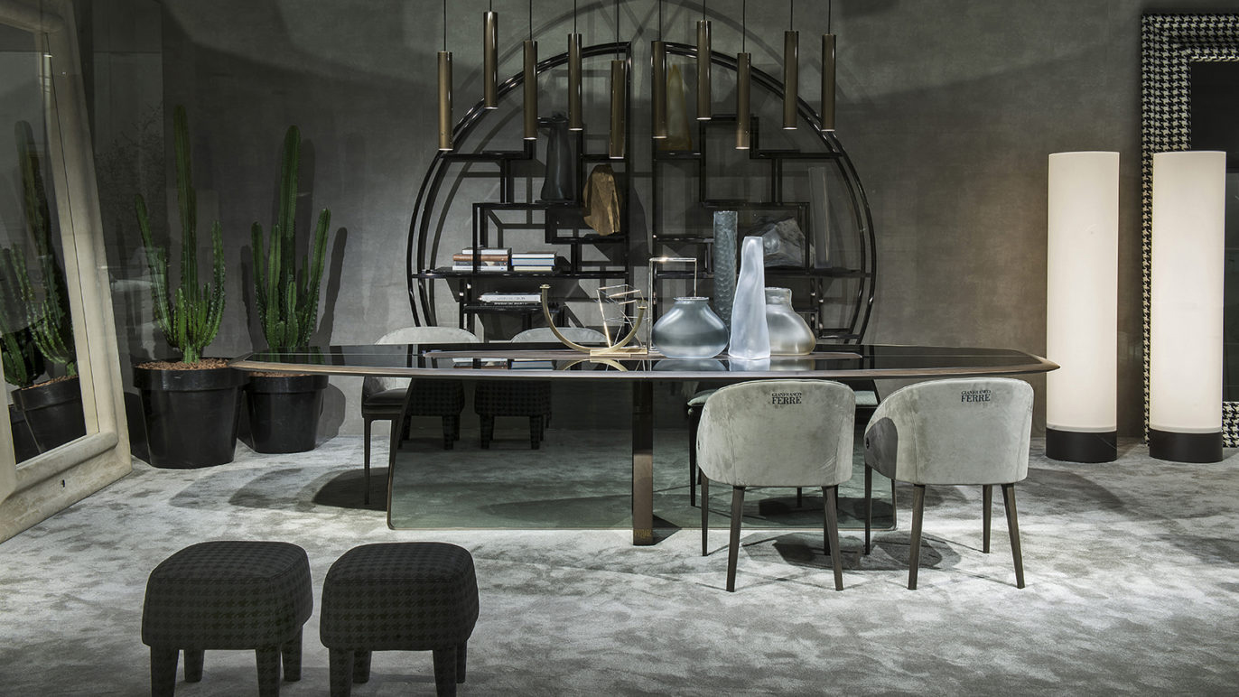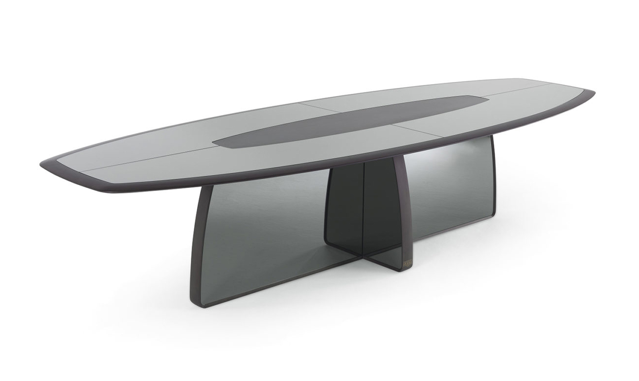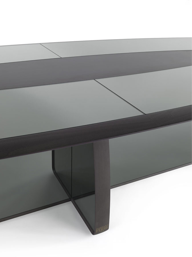 Essential shapes and clean lines characterize Wynwood dining table. The imposing structure and the important dimensions are softened by the smoked glass panels, which give lightness to the whole. The brown, greys and smoky hues that feature the piece lend the whole a timeless elegance with a metropolitan appeal.