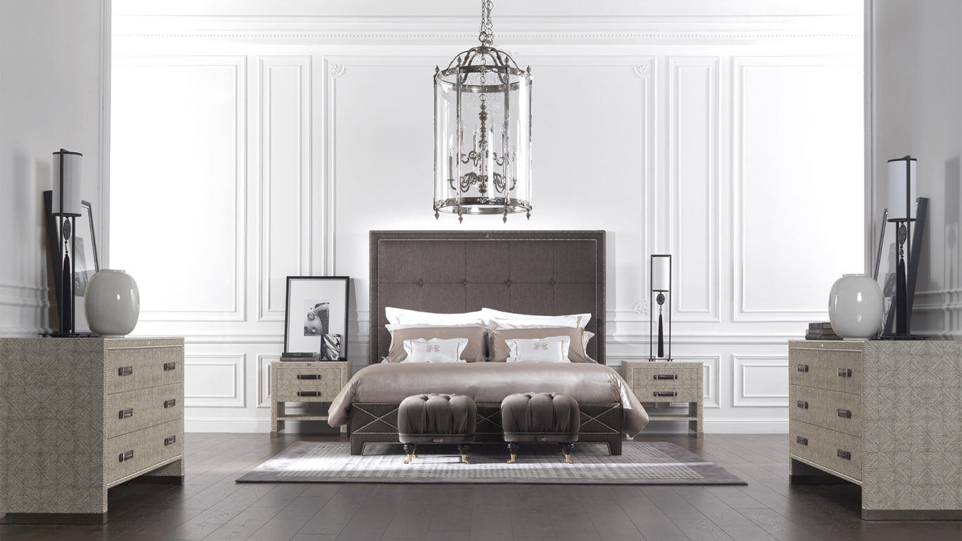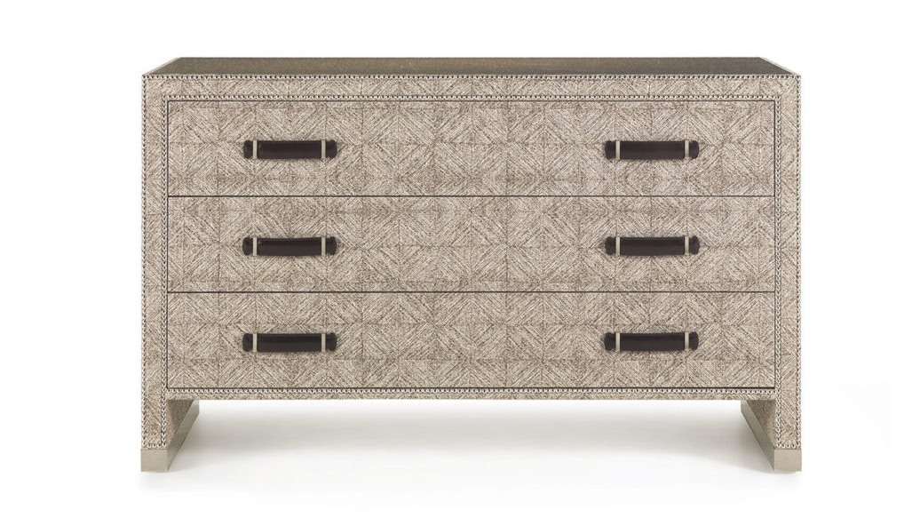 Chest of drawers with structure in multi-layer poplar. Outside covered in fabric cat. B | L.14.31. Inside covered in microfibre. Leather handles, glass top, metal leg caps. Ornamental metal nailheads.