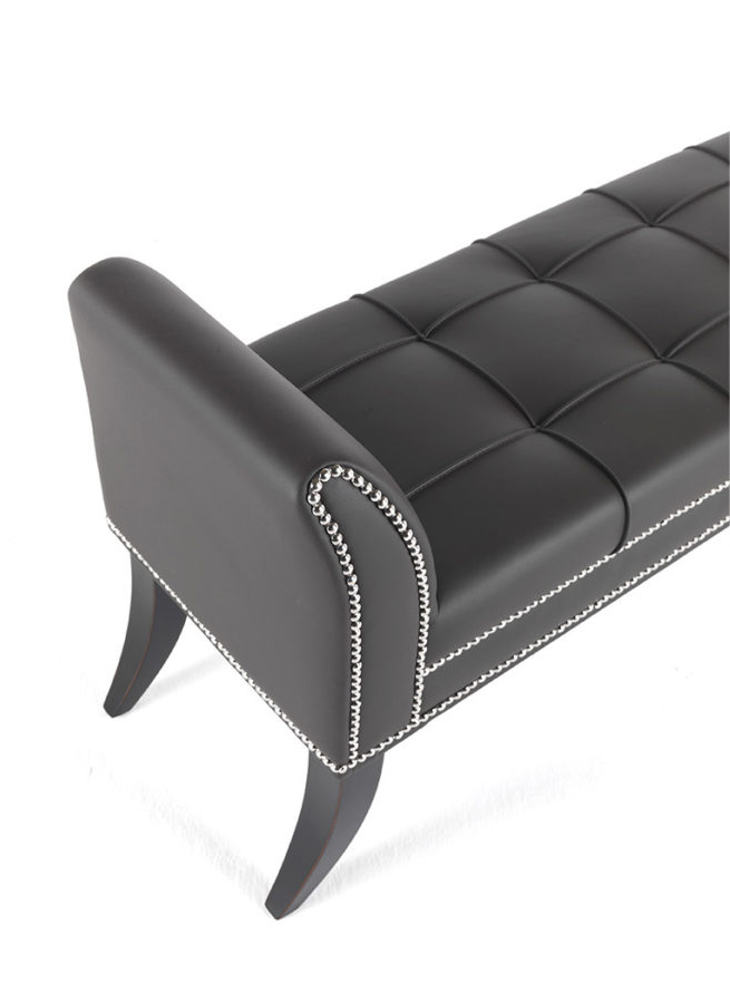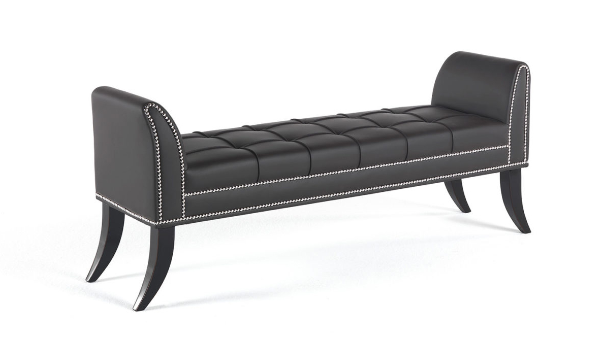 Bench with structure in beech wood and foam. Upholstery in leather cat. A | L.02.05. Ornamental metal nailheads. Legs in black lacquered finishing.