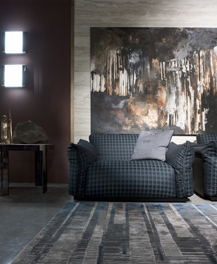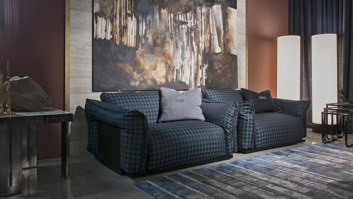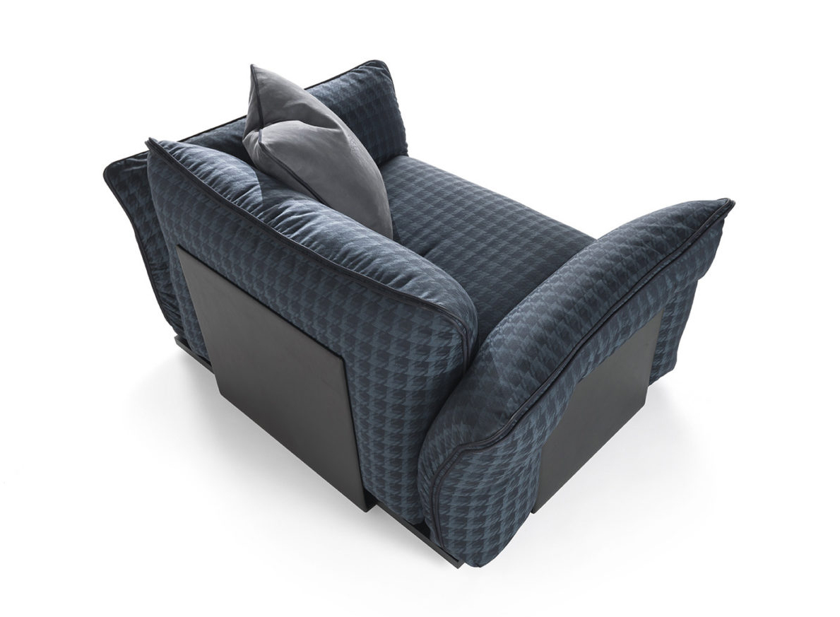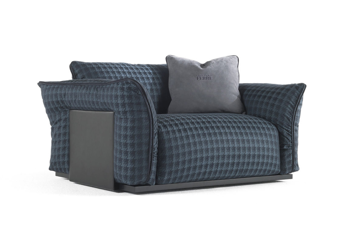 An attractive armchair with a comfortable seat and a contemporary design. The geometric volumes are emphasized by the external plates in metal upholstered in leather and by the piping in the same material. The upholstery in fabrics inspired by men`s fashion, such as houndstooth, or in leather, further enhances the urban charm of the sofa, giving it a touch deeply in line with the identity of Gianfranco Ferré Home.