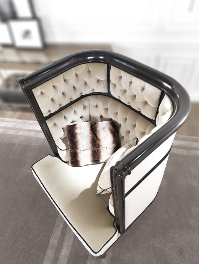 An impressive and welcoming armchair, created to amaze and dominate the scene. The high and welcoming seatback is characterized by the refined Capitonné manufacturing and by the carved wood structure which follows the external perimeter, recalling the Louis XV style feet. The brick red piping further defines the volumes of the padding, adding style to the set.