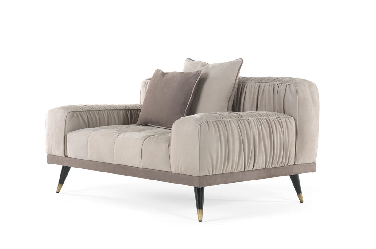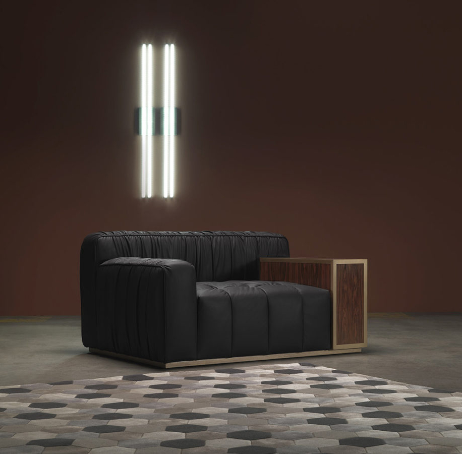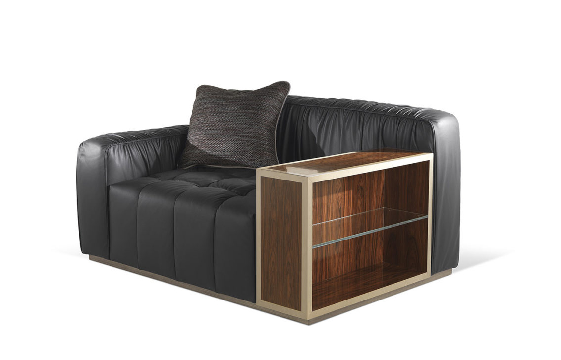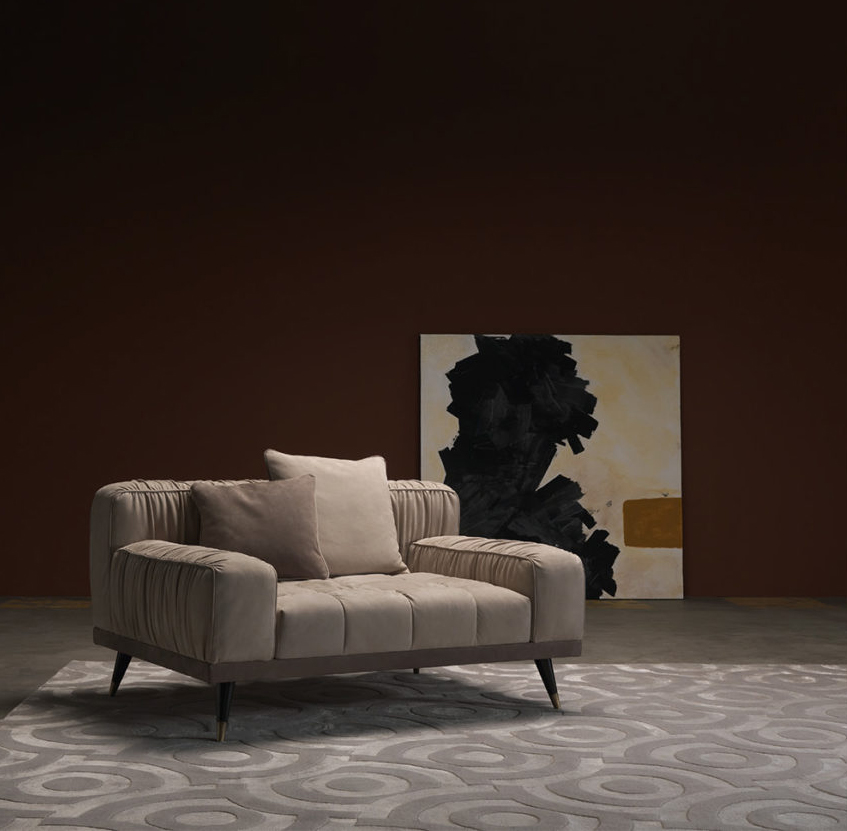 An armchair with a modern look, characterized by a low backrest and fine tailoring alternating pleated and quilted elements. With its elegant silhouette and its eclectic style, the Highlander armchair can easily be inserted in different environments, from the living room, to the study, to the sleeping area.