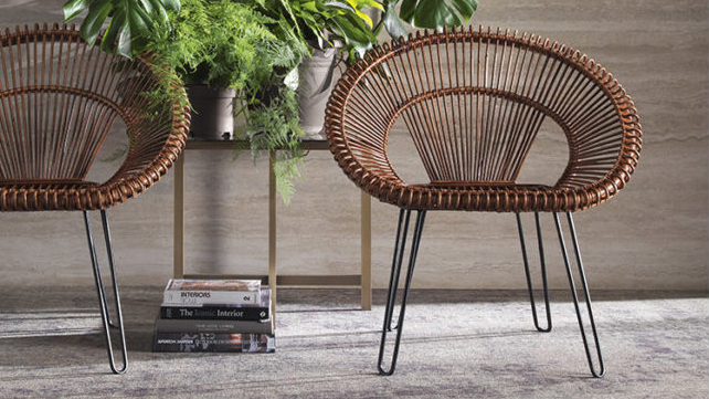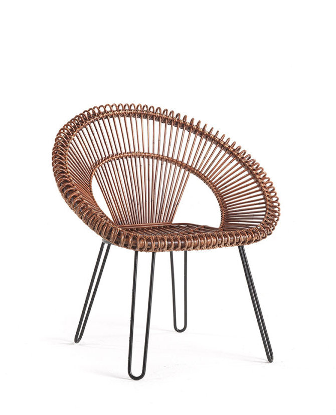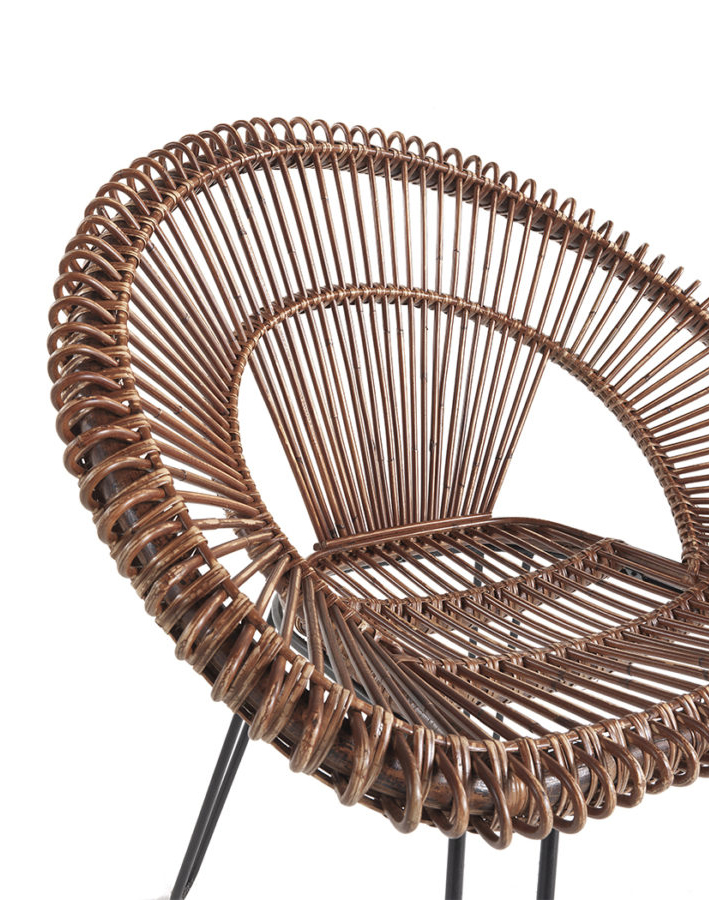 The exotic appeal of the rattan bind for an outdoor armchair inspired by the natural shapes and materials. Nest armchair, with its enchanting shell shape which contrast with the linearity of the thin steel legs, is an original piece of furniture able to lend a sophisticated elegance to the outdoor setting.
