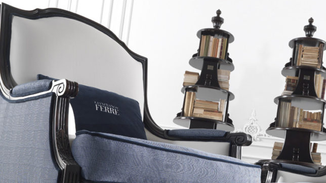 An original game of contrasts between materials, styles and colors. The Sweet Armchair combines Louis XV structure and armrests, a white fabric upholstery and blue Prince of Wales cushions. A strong visual impact with a sophisticated allure combining different references and inspirations in perfect Gianfranco Ferré style.