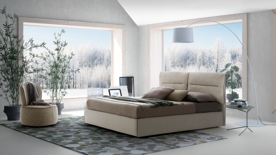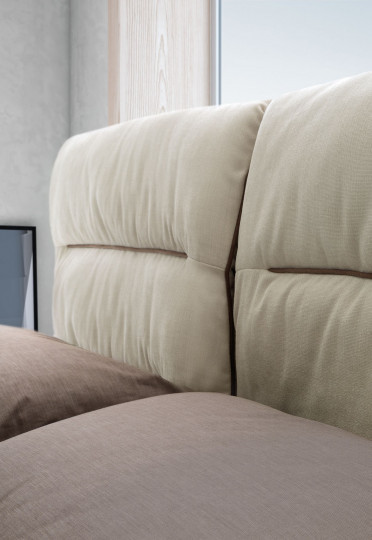 Upholstered bed with container, Academy features a cautious adherence to certain standards of simplicity, allowing only a softly-spoken raised border to infer. The headboard, however, becomes the exception to the rule, thanks to the unusual, but highly original, overturned orientation of the cushions which can be raised, inaugurating unexpected positions of comfort, a must to be experienced.