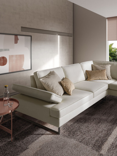 Elegance and composure characterize, at first glance, this sofa which appears refined and quiet. The special sliding feet, however, anticipate the true soul of Luis: movement. An innovative backrest mechanism increases or decreases at will the seating area, whilst the reclining armrest allows for variety of body postures, making it a multi-faceted accessory.