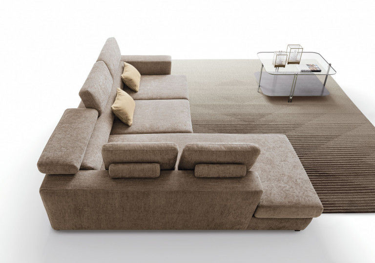 Overlapping horizontal surfaces give depth to the sofa’s backrest. Plaris calls for comfort with a reclining headrest and the well-chosen accessory that highlights its functionality. This sofa is upholstered in fabric and has sliding seats.