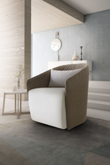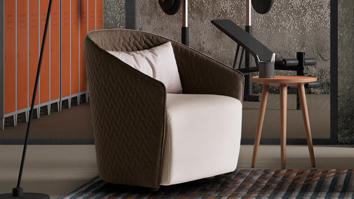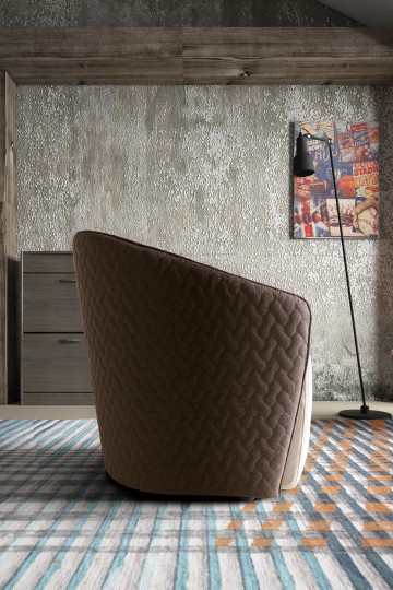 Much like a gem is mounted on precious jewellery, and thanks to the bright colour of its upholstery, Viky`s wide and comfortable seat shines as a luminous heart within a solid case, whose back is elegantly bent. With their placid slopes, its sides culminate with a reassuring horizontal rail; furthermore, the lively pattern of the padded cloth unequivocally establishes how this refined armchair achieves a polished balance of elements.