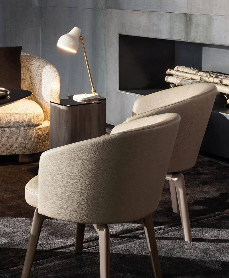 The padded structure is made of a cold-formed foam shell covered in soft padding and rests on a base available in two finishes: solid ash with open-pore Chestnut or Moka stain and solid beech with glossy lacquer finish in Sand, Granite or Mud. The option to choose the base, and the many different upholstery selections available for the seat, make Amélie an especially versatile chair that can lend understated elegance to any type of decor. The Amélie little armchair comes in versions with fixed or swivel base and can be paired with all the tables in the collection.