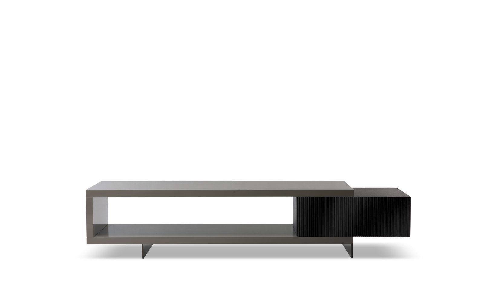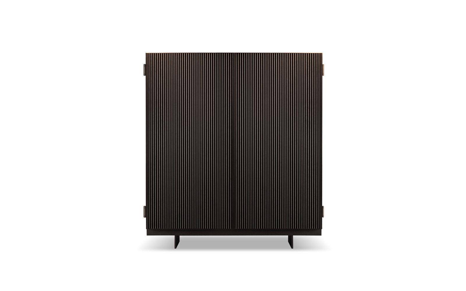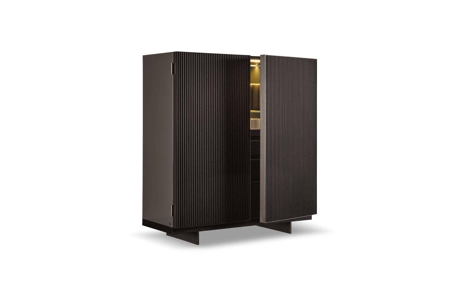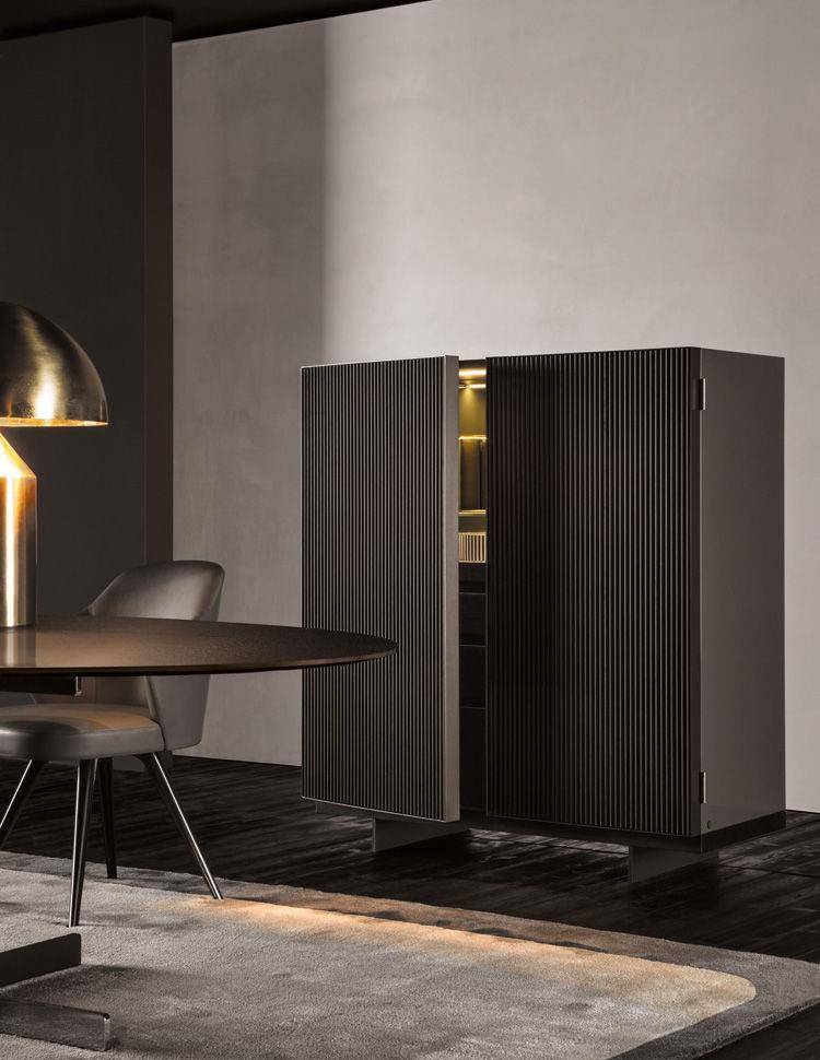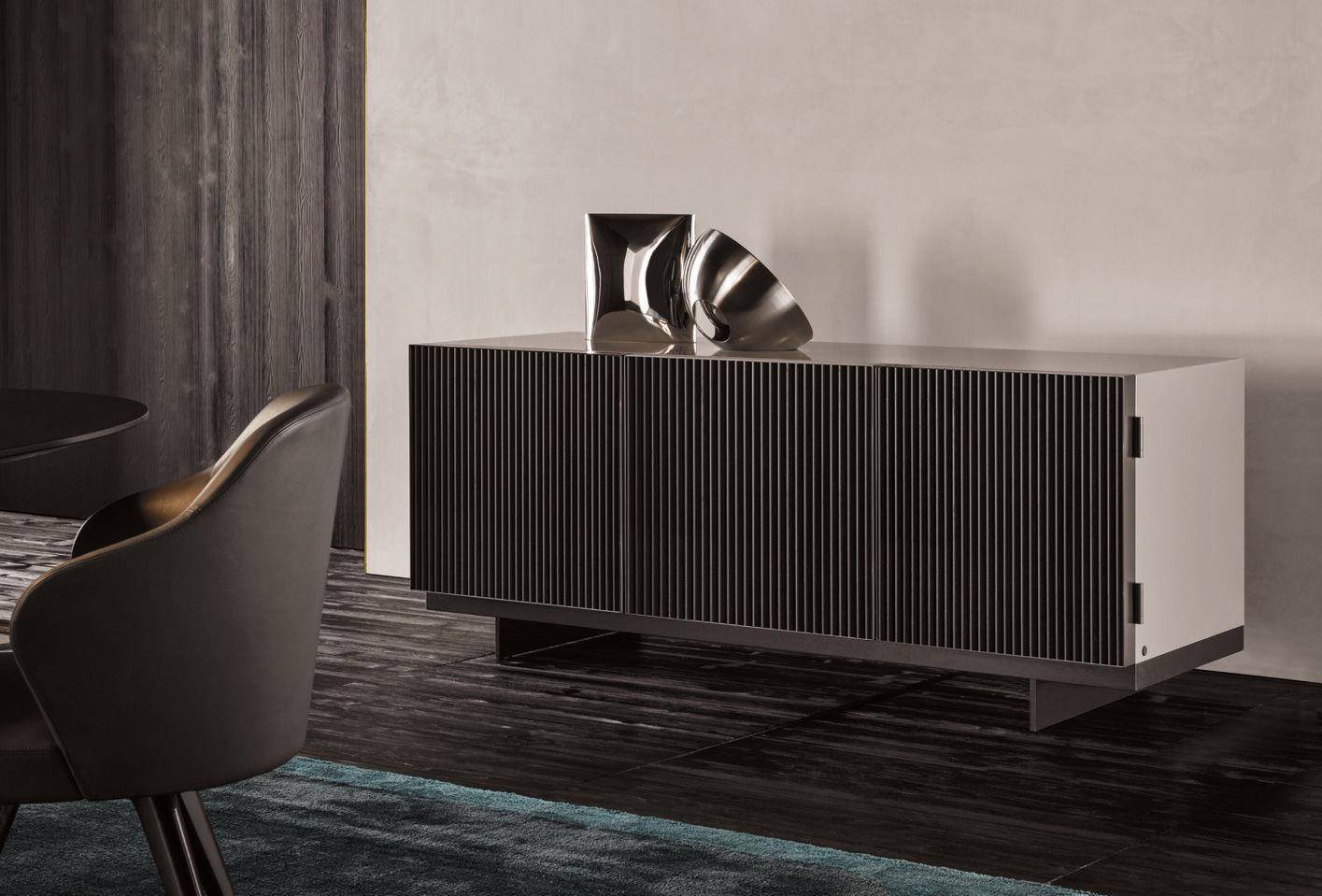 The sophisticated workmanship that distinguishes the Aylon family of cabinets traces back to the heritage of cabinet-making typical of Italy’s Brianza area. The sleek shapes combine with a taste for refined details, like the unusual workmanship on the doors, created through the use of turned strips of solid oak, with open pore Moka color lacquer finish, set into an elegant metal frame with a matt Pewter color finish. The meticulous attention focused on each construction detail is also evident in the hinges, crafted from an exclusive Minotti Studio design. The hinges can be adjusted for height, width and depth and allow the doors to open 190 degrees. The structure comes in glossy lacquer Sand, Clay or Granite finish. The Aylon series includes two sideboards, a cupboard and a living-space unit featuring a clever play of shapes, with a lateral projecting storage element.